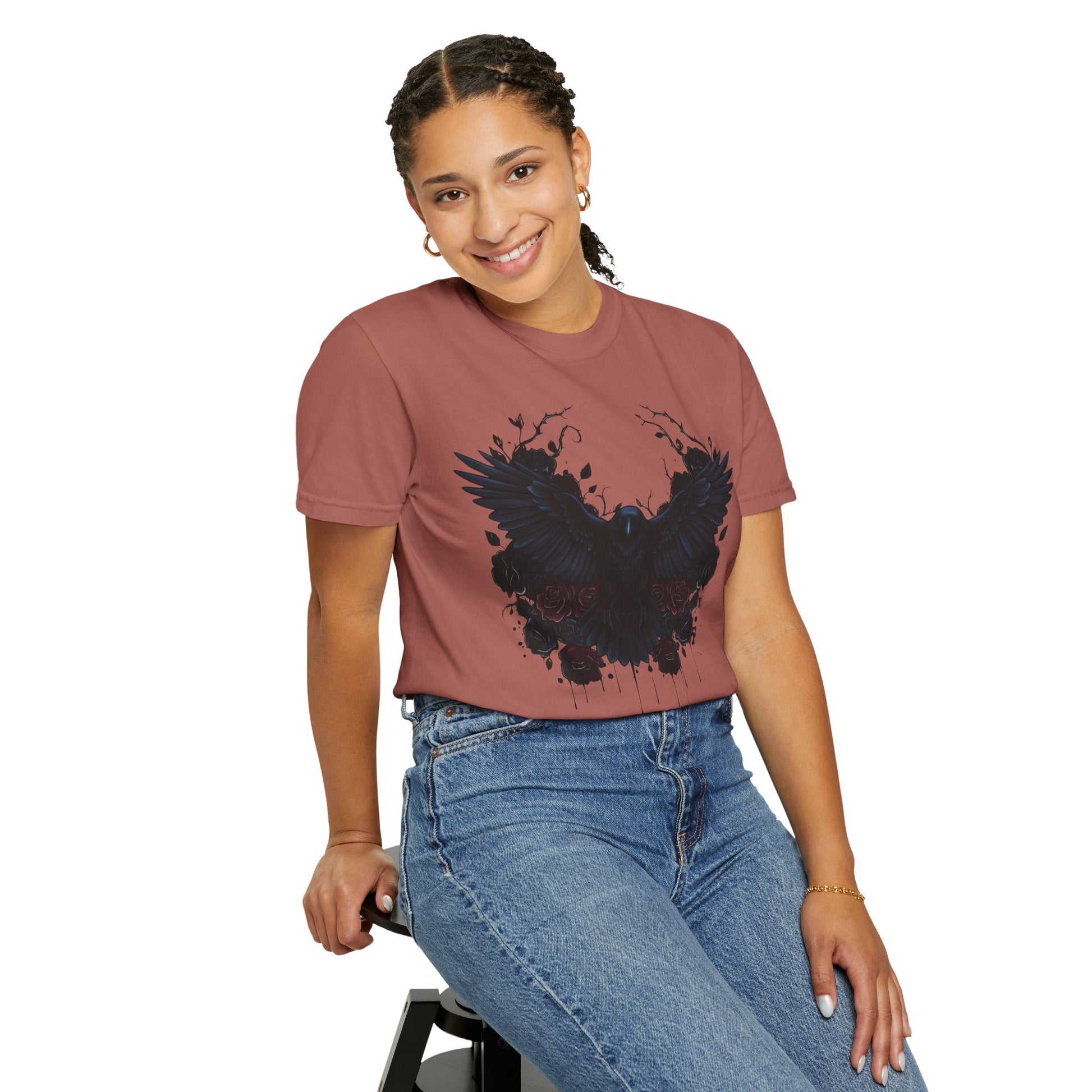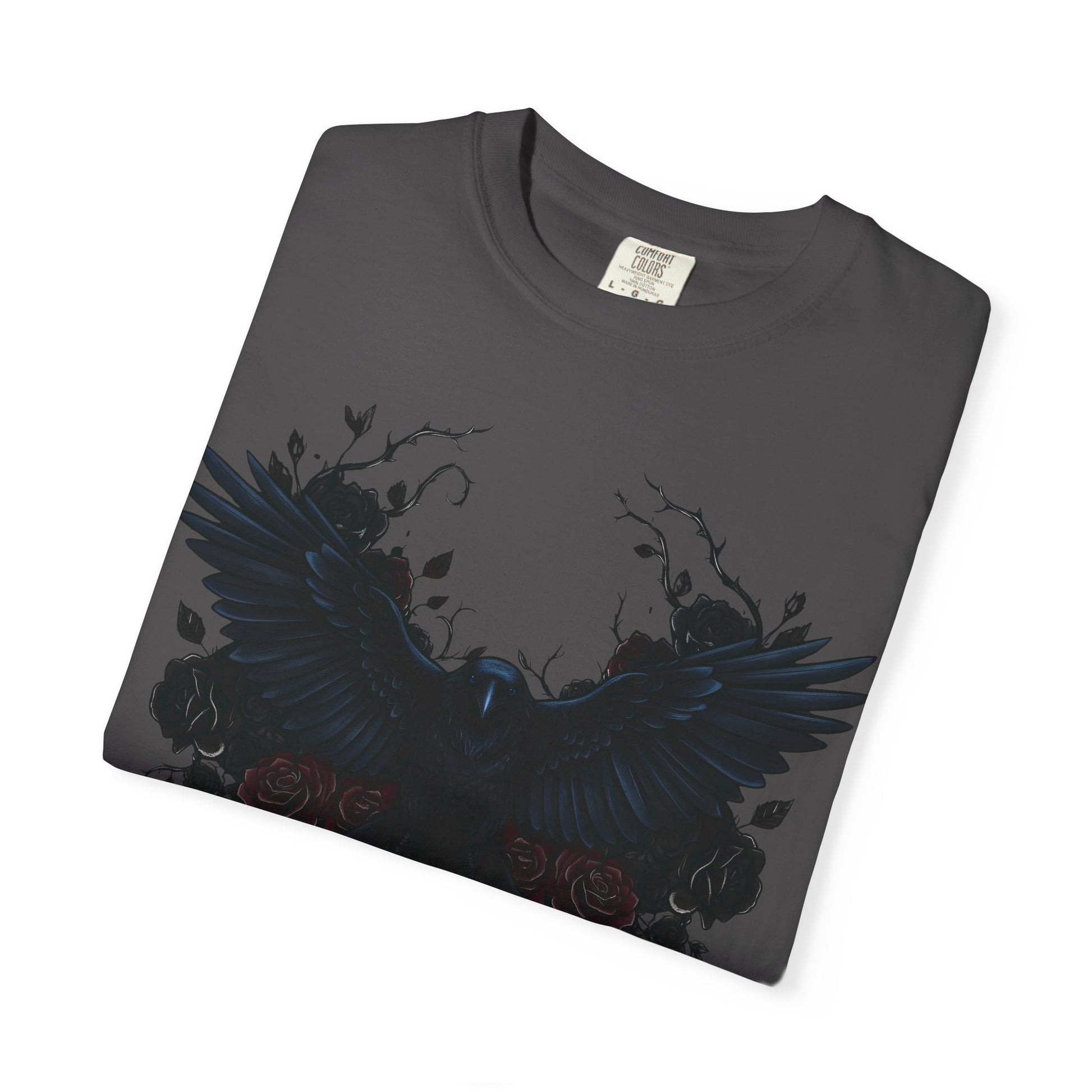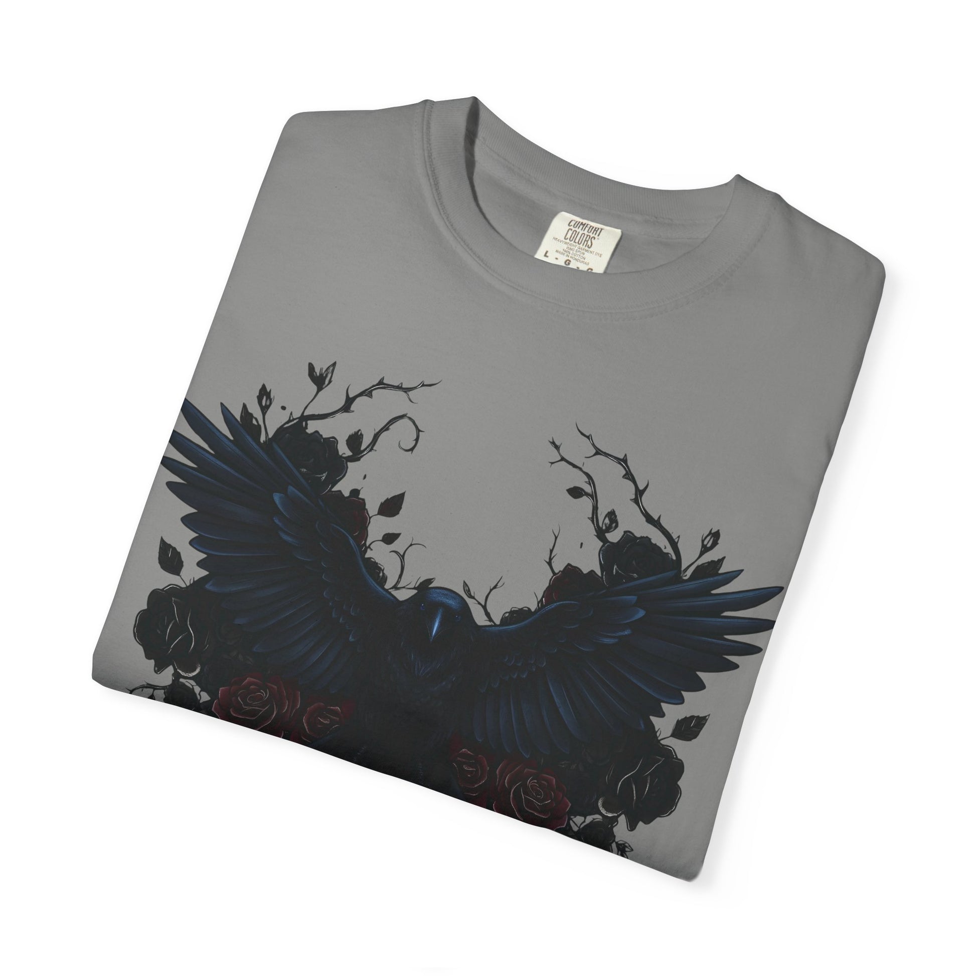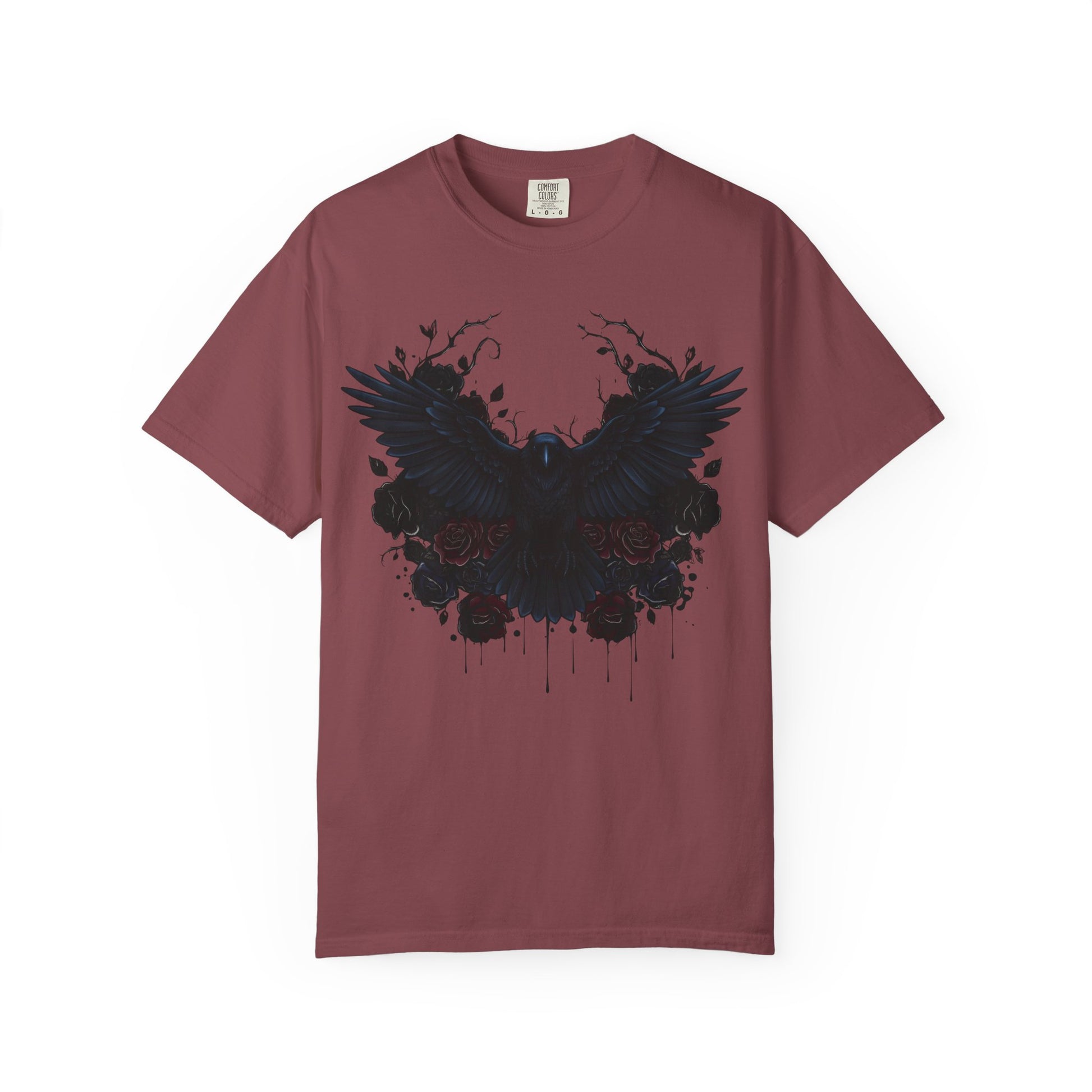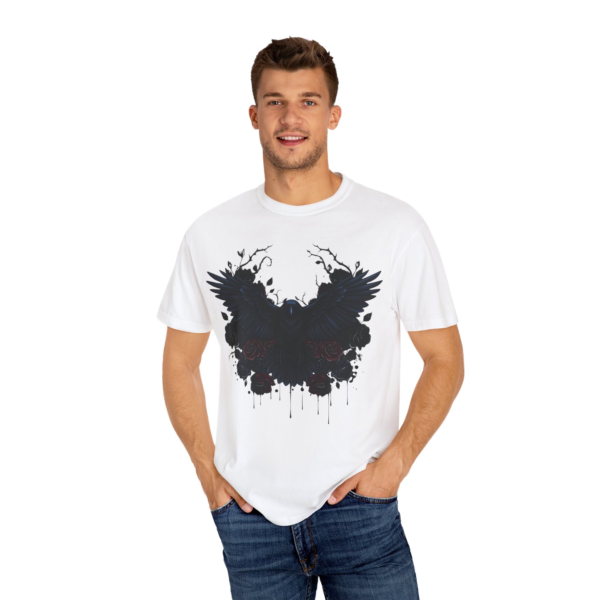 The garment-dyed process infuses each shirt with rich, deep colors, giving it a distinctive, vintage-inspired look that captures the mysterious allure of dark raven imagery. Its versatile design makes it suitable for all body types, with an extensive size range from S to 4XL, ensuring everyone can find their perfect fit.