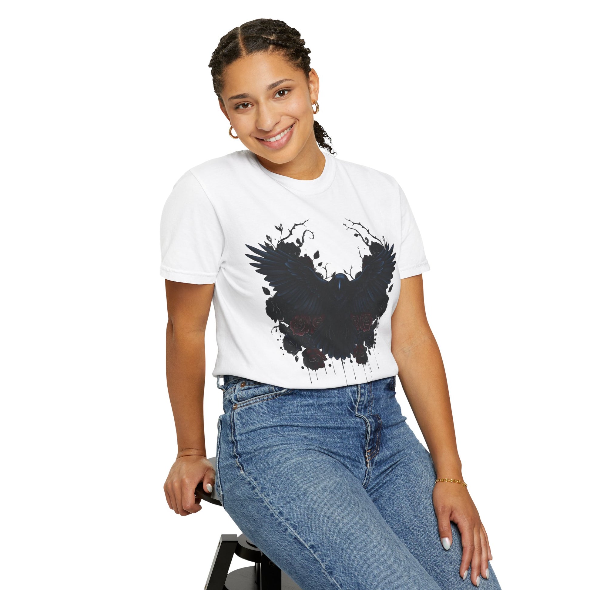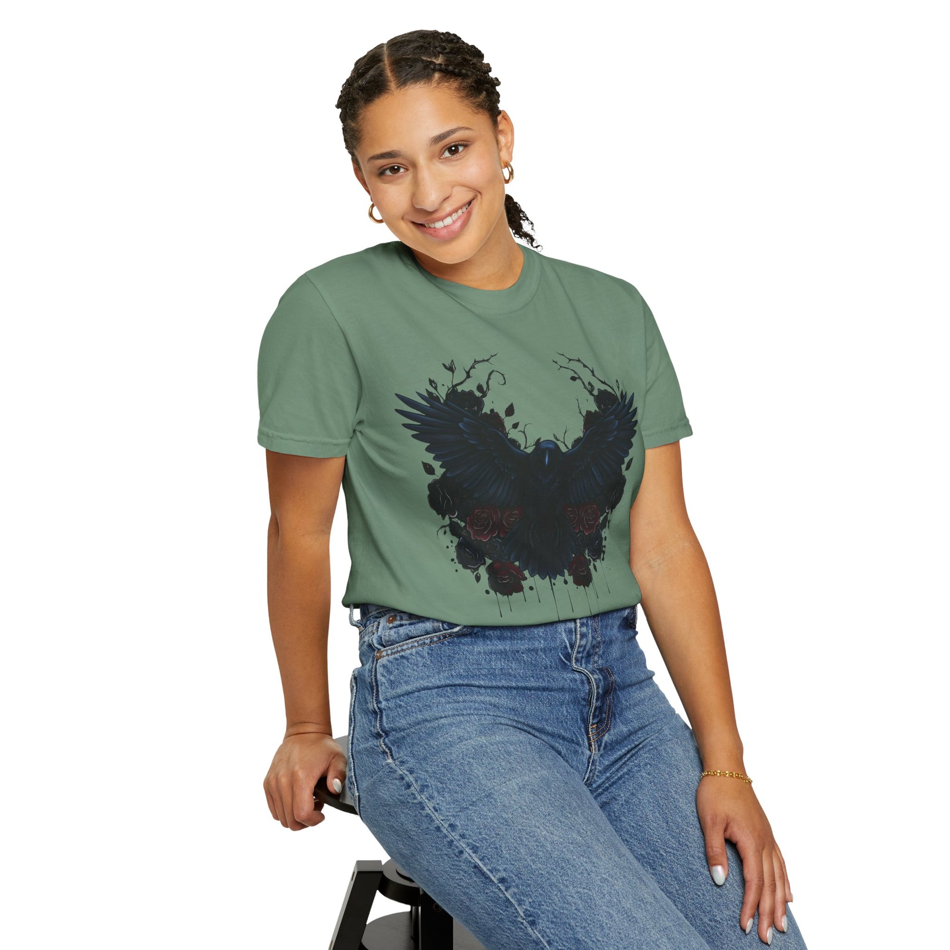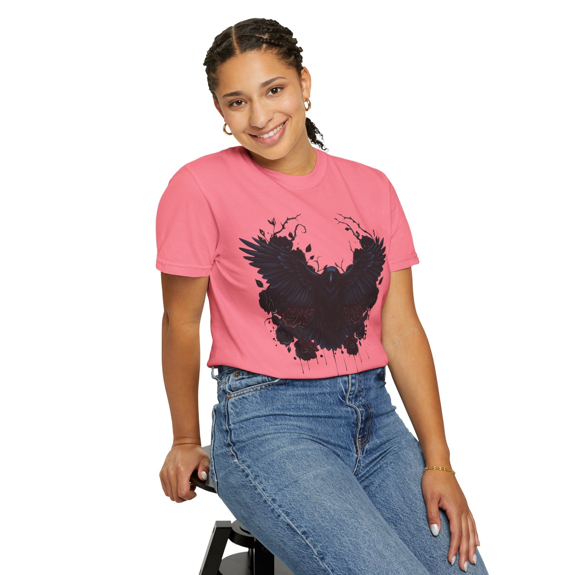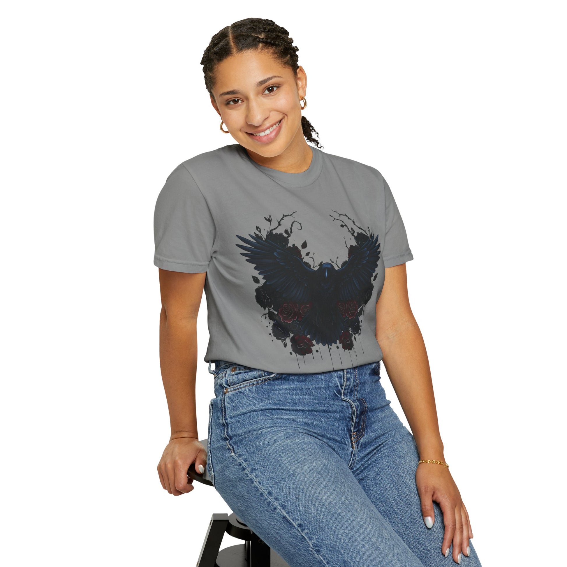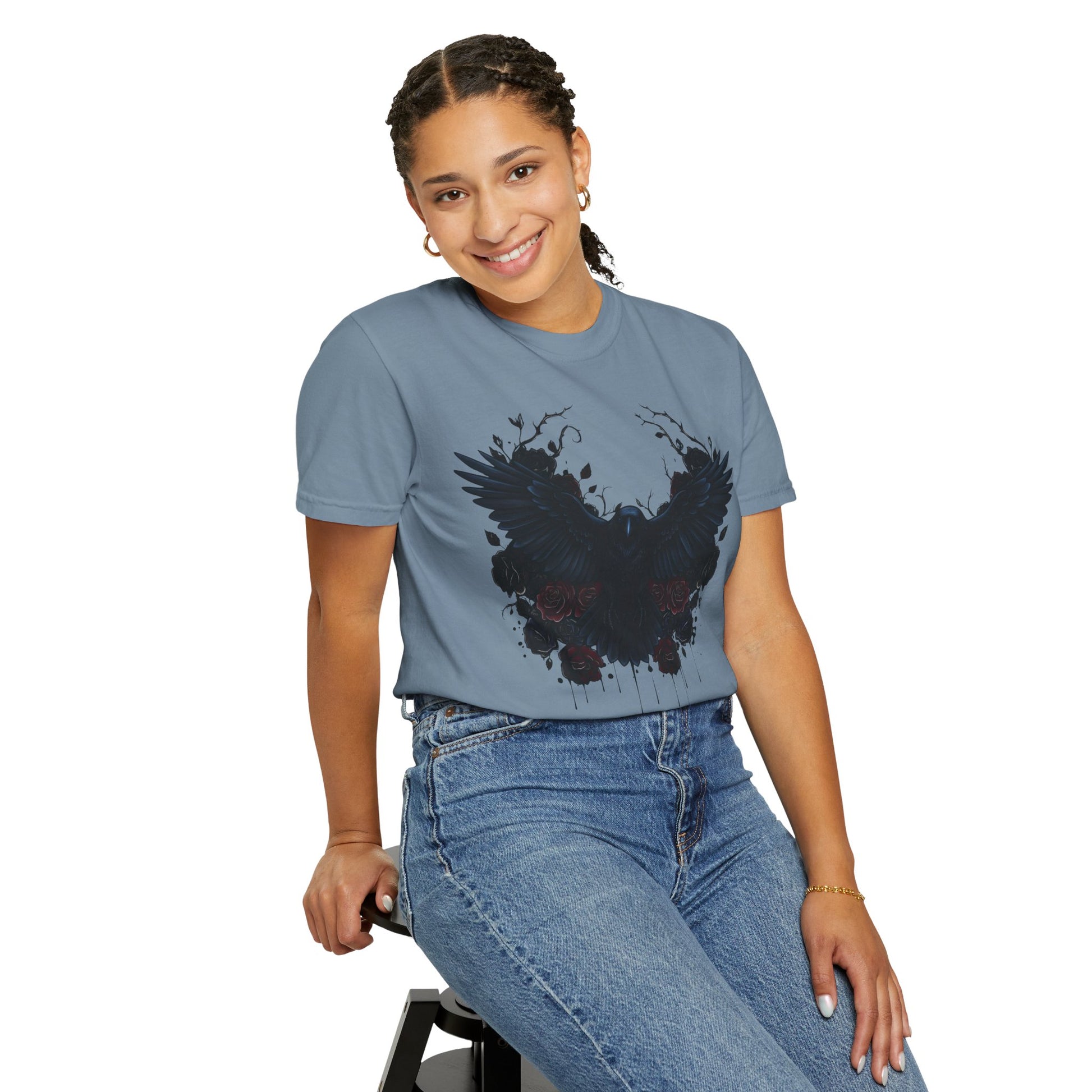 The garment-dyed process infuses each shirt with rich, deep colors, giving it a distinctive, vintage-inspired look that captures the mysterious allure of dark raven imagery. Its versatile design makes it suitable for all body types, with an extensive size range from S to 4XL, ensuring everyone can find their perfect fit.