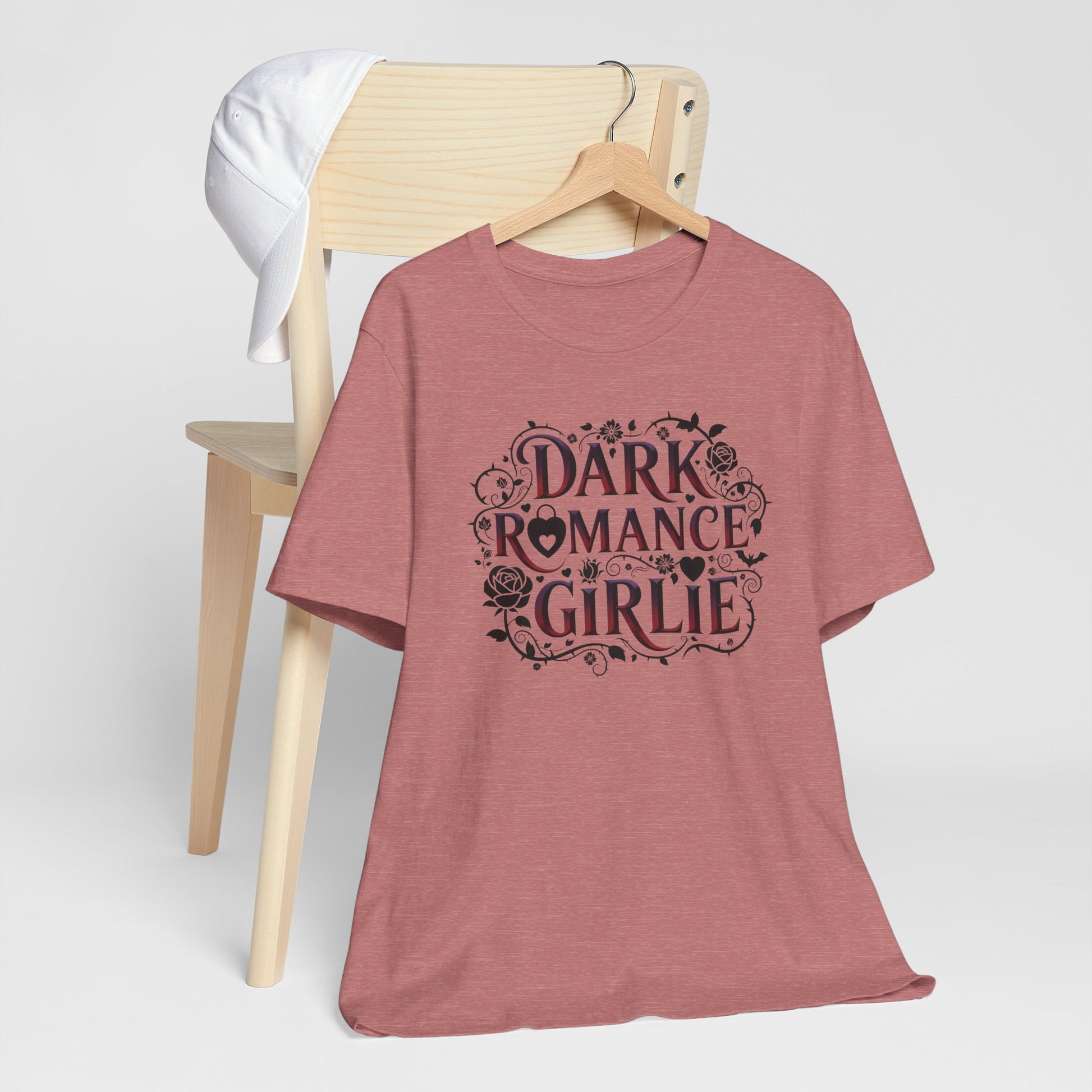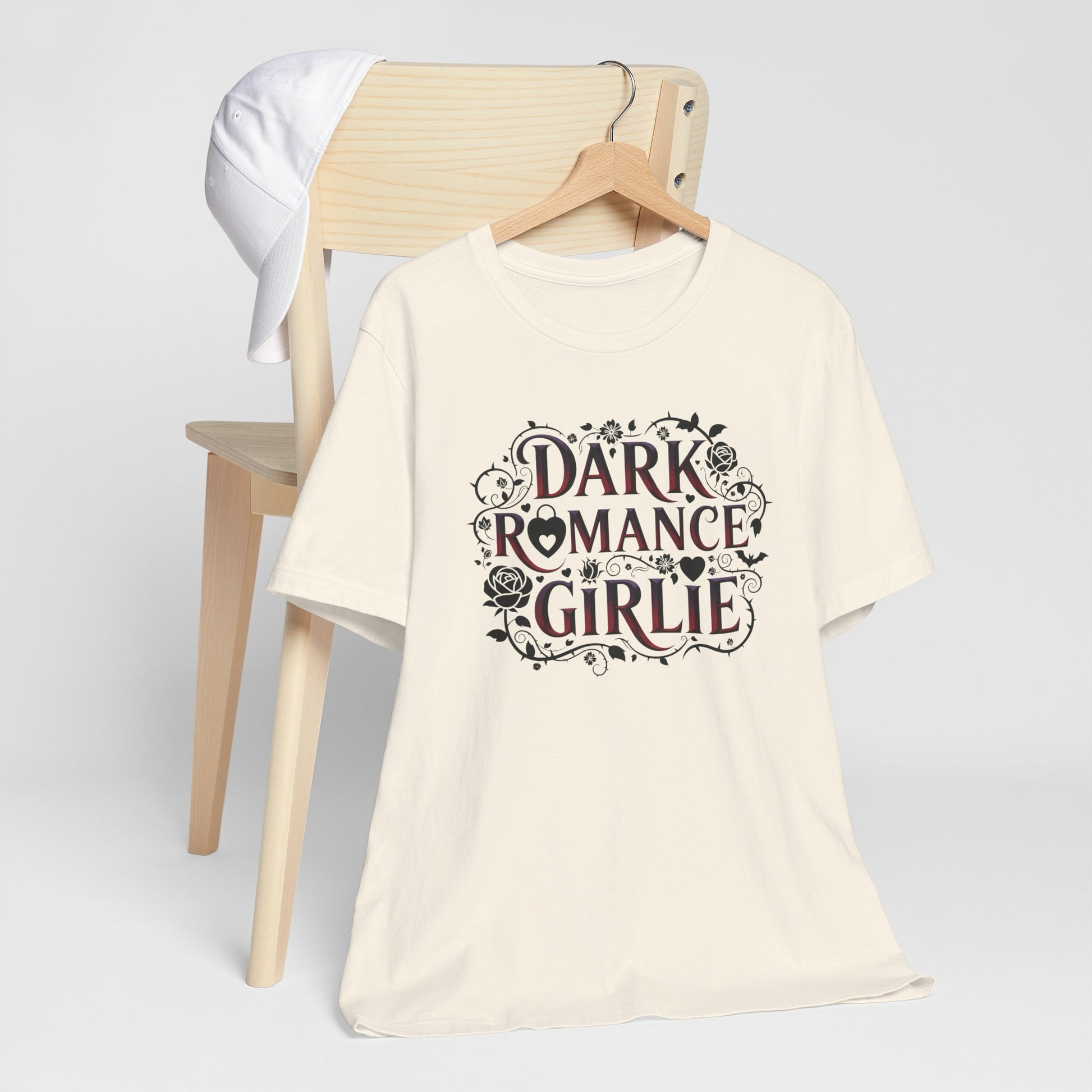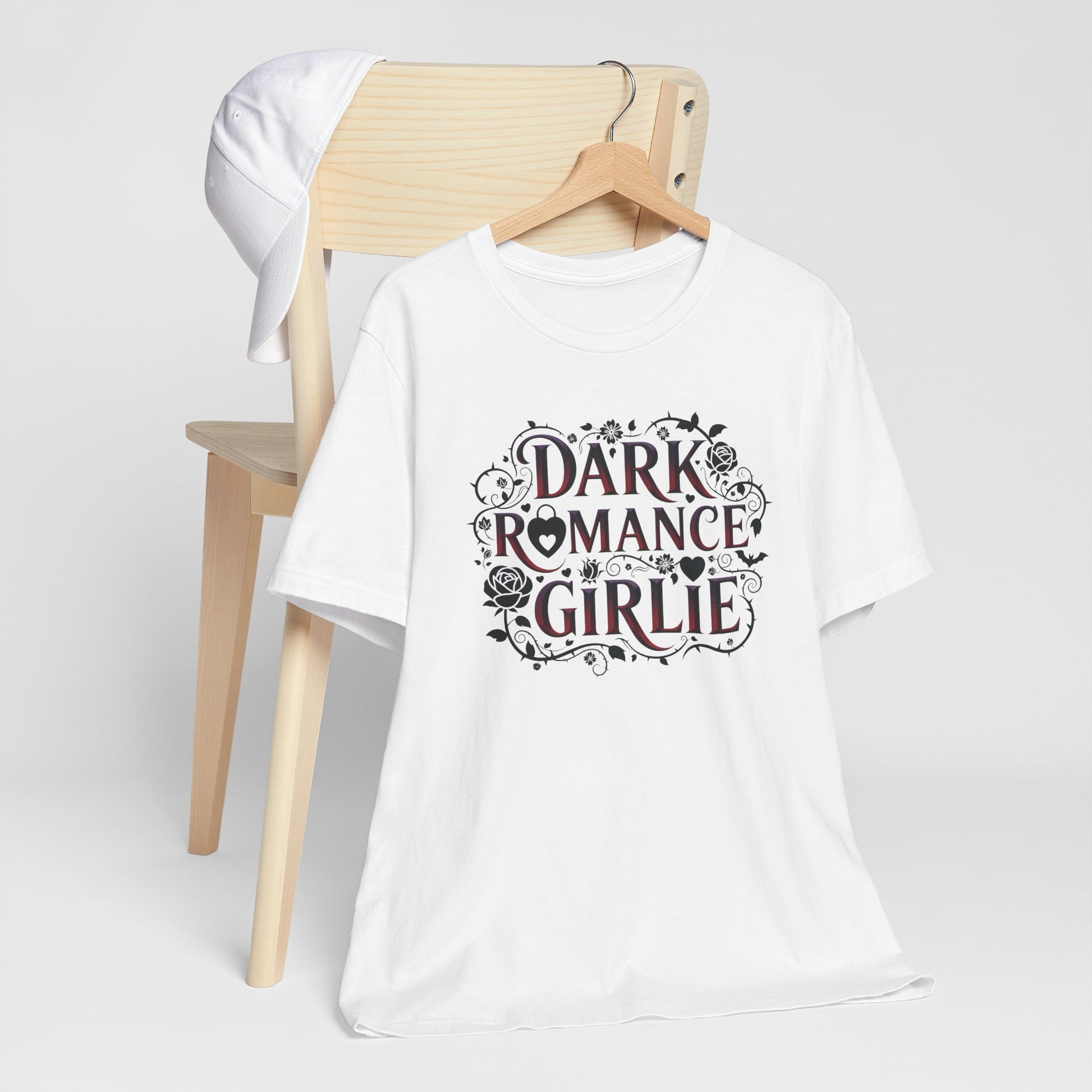 Soft, breathable cotton meets moody, bookish charm. This lightweight tee wears like a well-loved novel — easy to layer, gentle on the skin, and casually expressive. The centered floral-accented type reads “Dark Romance Girlie,” pairing gothic-inspired lettering with delicate roses and subtle vine details. It settles into quiet mornings with a steaming mug and a bookmarked paperback, or into evenings at low-lit bookshops and intimate reading nights. The retail crew neckline keeps the silhouette clean and simple so the design can take center stage. Comfortable enough for everyday wear, it also pairs naturally with high-waisted jeans, a leather jacket, or a worn-in cardigan for a layered, romantic look.