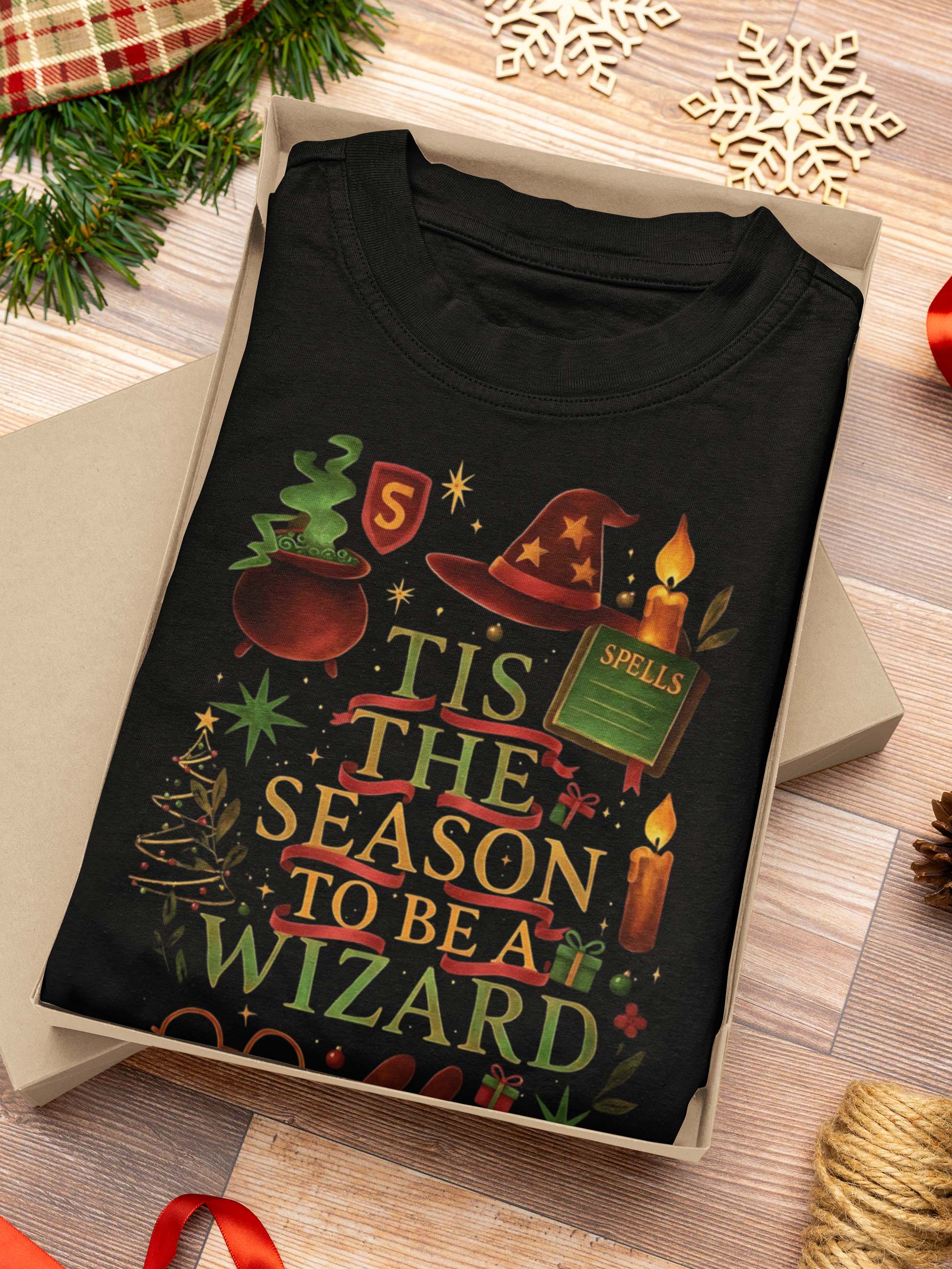 Experience a touch of magic this holiday season with the Festive "Tis the Season to be a Wizard" Potter Fan T-shirt. Perfectly crafted for true potter heads, this tee brings the enchanting aura of Hogwarts into your wardrobe, making it an ideal choice for Harry Potter fans seeking that special wizarding world touch. Whether you're hunting for the ultimate Harry Potter gift, planning secret Santa ideas, or searching for work colleague gifts, this Hogwarts shirt is a spellbinding addition. Let your harry potter xmas take flight with a dash of whimsy and enchantment, as this stylish harry potter shirt makes everyday feel like a visit to the wizard christmas banquet. Ideal as a work bestie gift, it’s a charming surprise that’ll warm the heart of any Harry Potter aficionado.