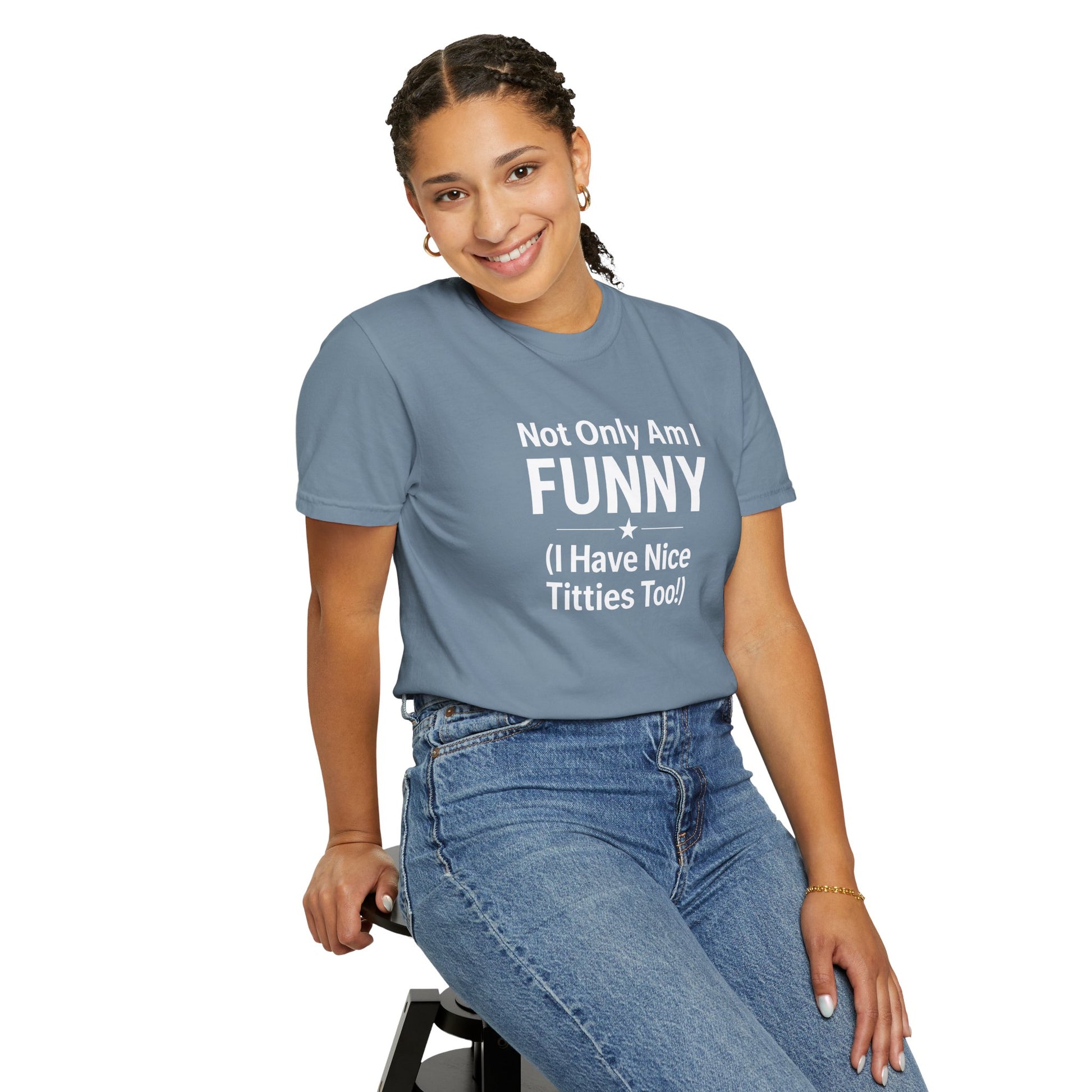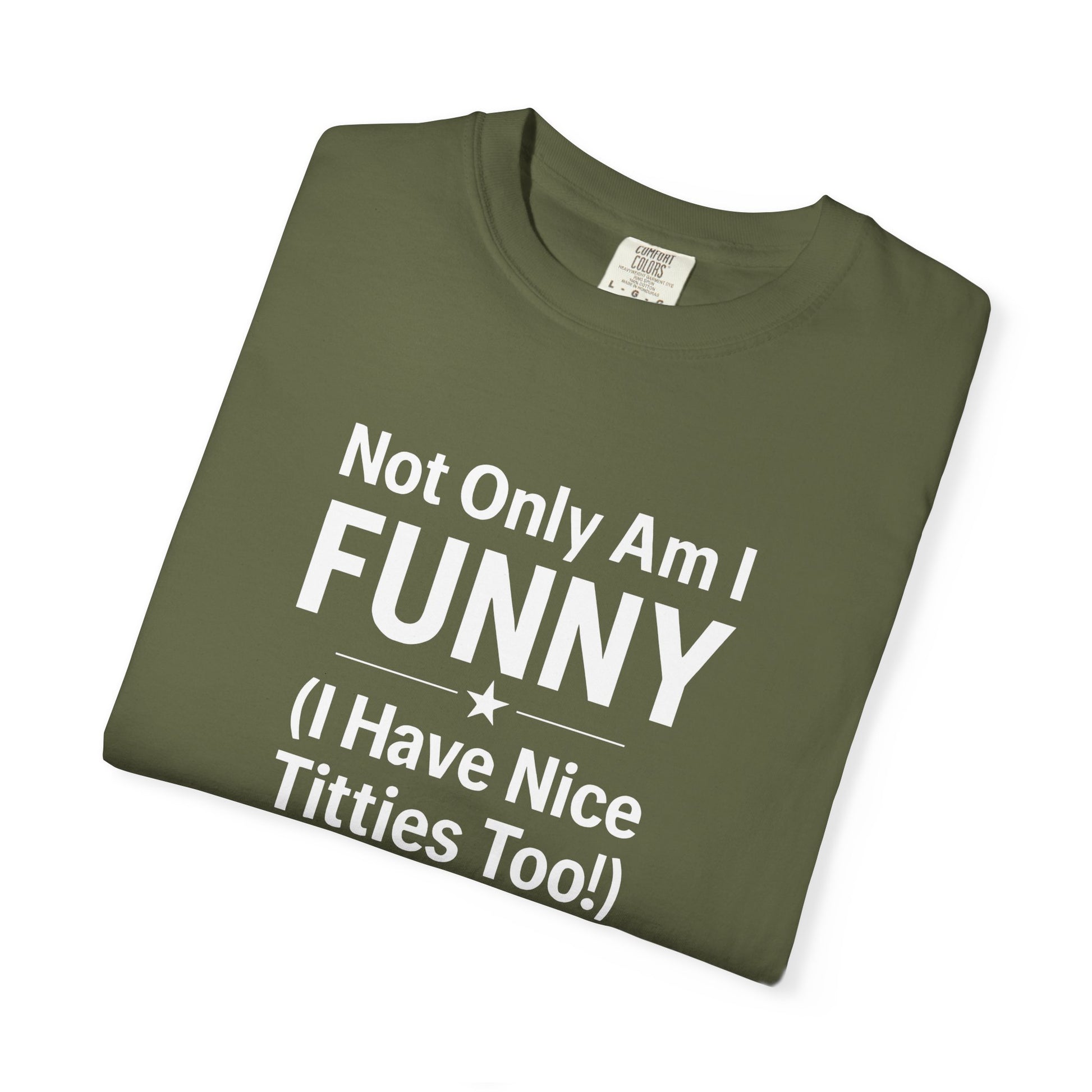 😂 Funny Women’s T-Shirt – “Not Only Am I Funny (I Have Nice Titties Too!)” Bring bold humor and confidence to your wardrobe with this hilarious women’s graphic tee, perfect for anyone who loves rude jokes, sarcasm, and not taking life too seriously. This shirt makes an unforgettable gift and a guaranteed conversation starter — whether you're out with friends, at the bar, or just living your best, funniest life. Designed for comfort and attitude, this tee features clean, bold typography that stands out beautifully on any shirt color.