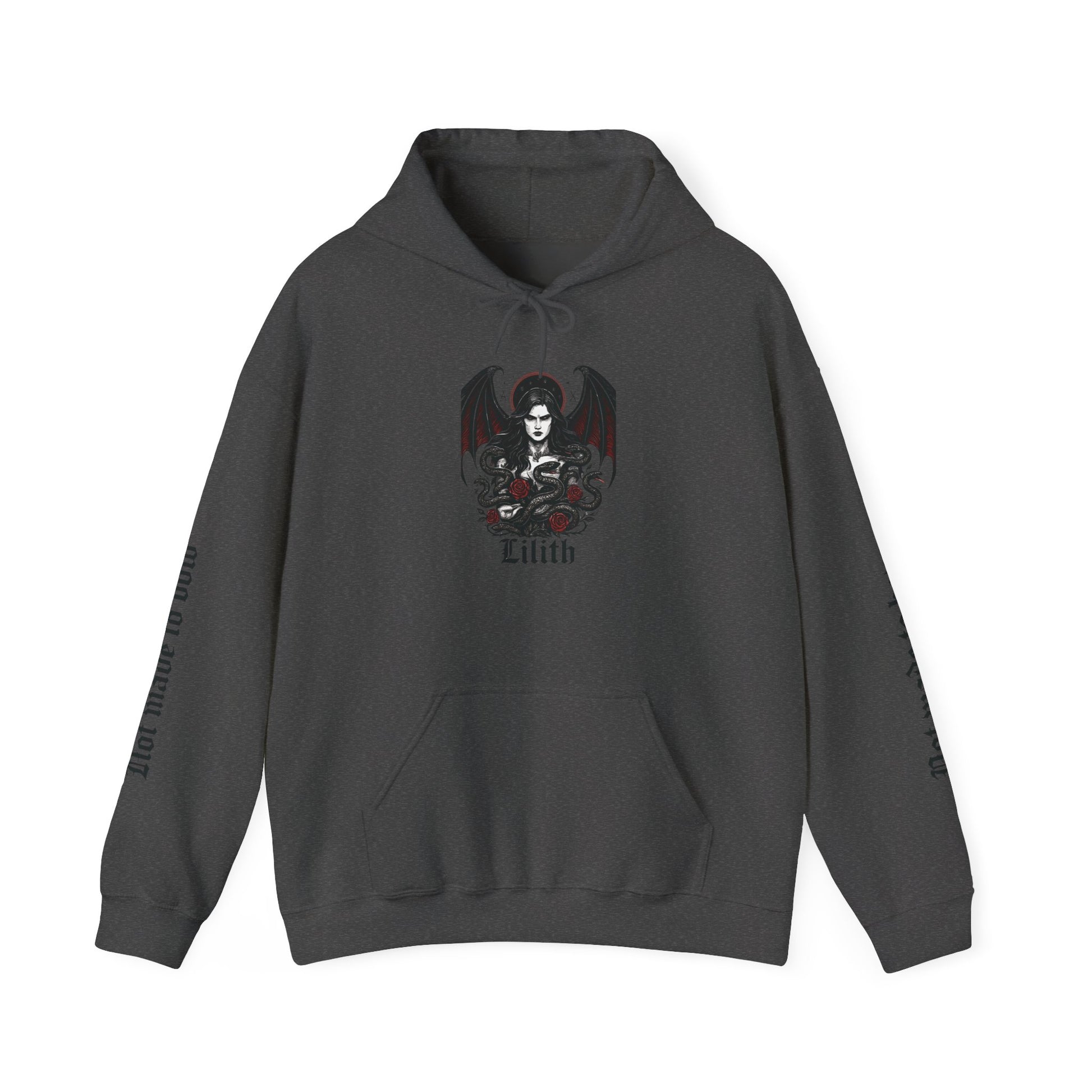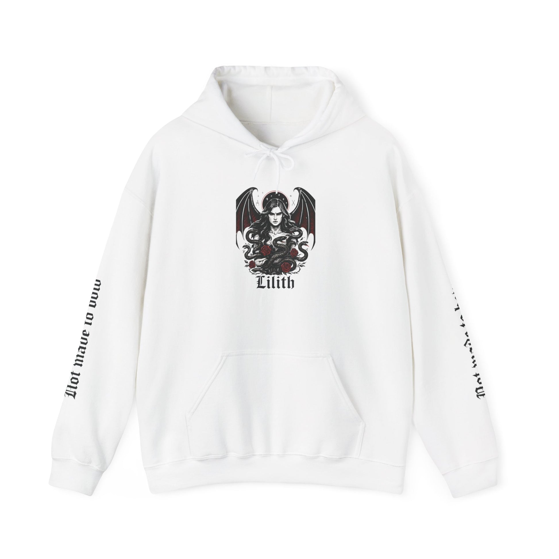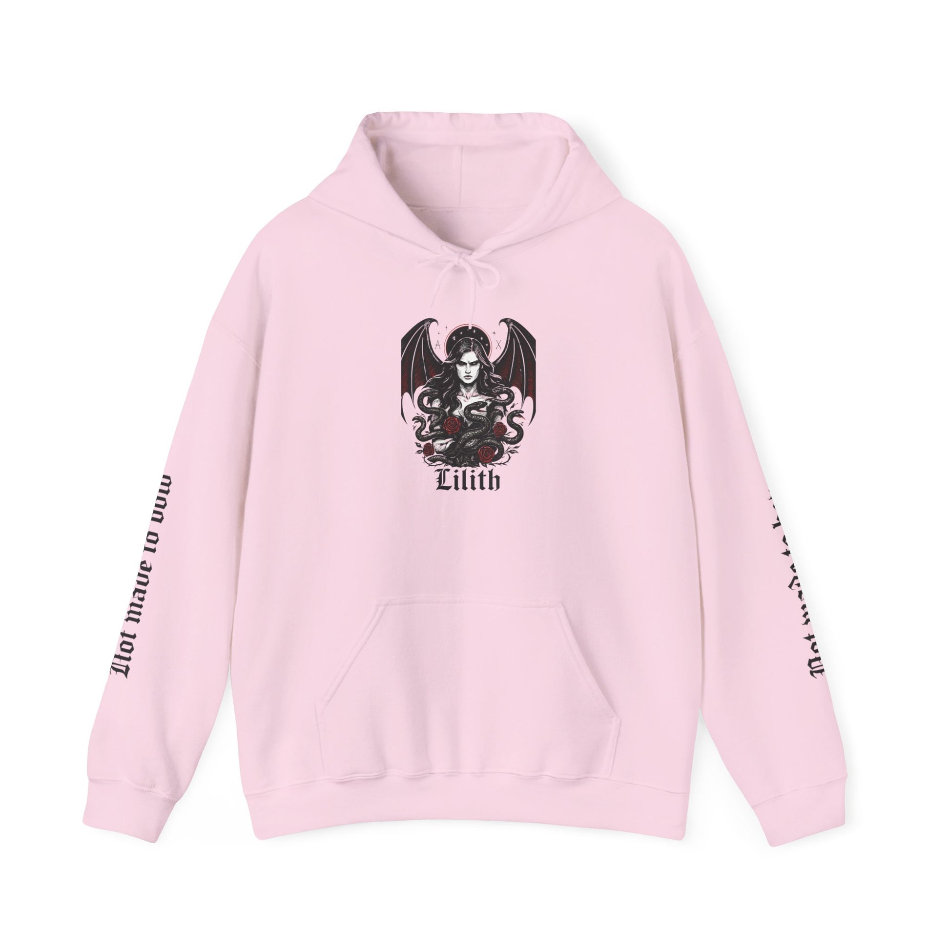 nveil your dark feminine allure with the enchanting Goddess Lilith Witchy Hoodie. This lilith hoodie, infused with the mystique of the Lilith symbol, is a perfect blend of gothic clothes and witchy clothes, making it a must-have for those who celebrate the pagan lifestyle. Embrace your inner dark goddess and let the lilith goddess guide your style journey with this beautifully crafted piece of pagan clothing. Whether you're exploring witchy things or seeking the comfort of a pagan hoodie, this top effortlessly merges elegance with the rebellious spirit of the goddess Lilith. -Lilith design on the front, "not made to bow" text on both sleeves