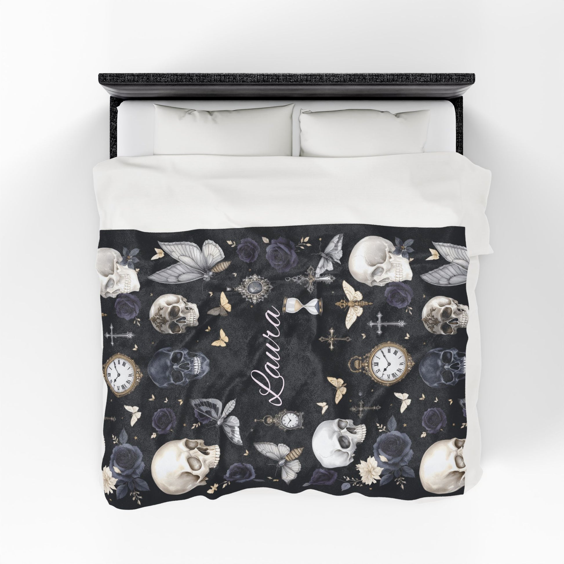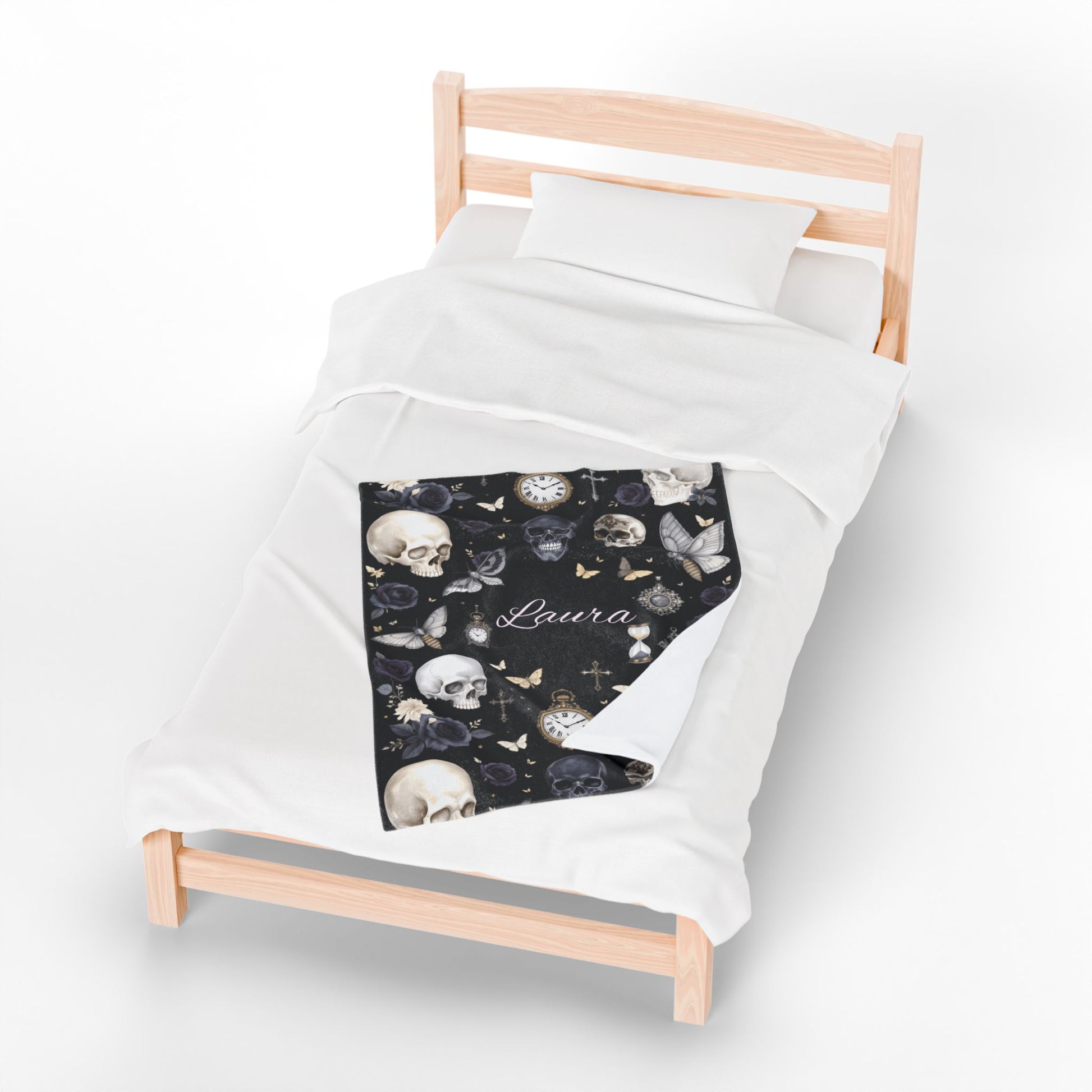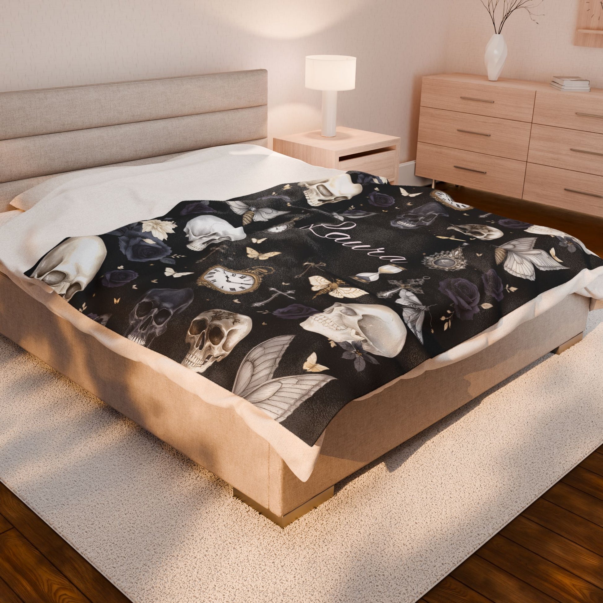 Gothic Skulls and Roses Velveteen Plush Blanket | Personalized Name Option