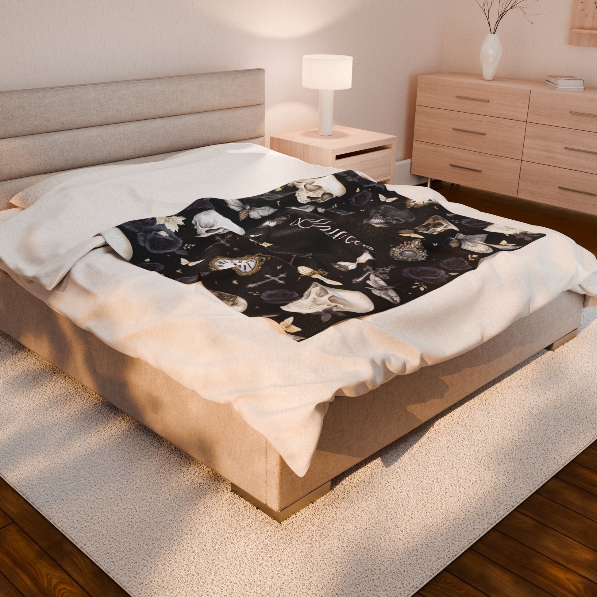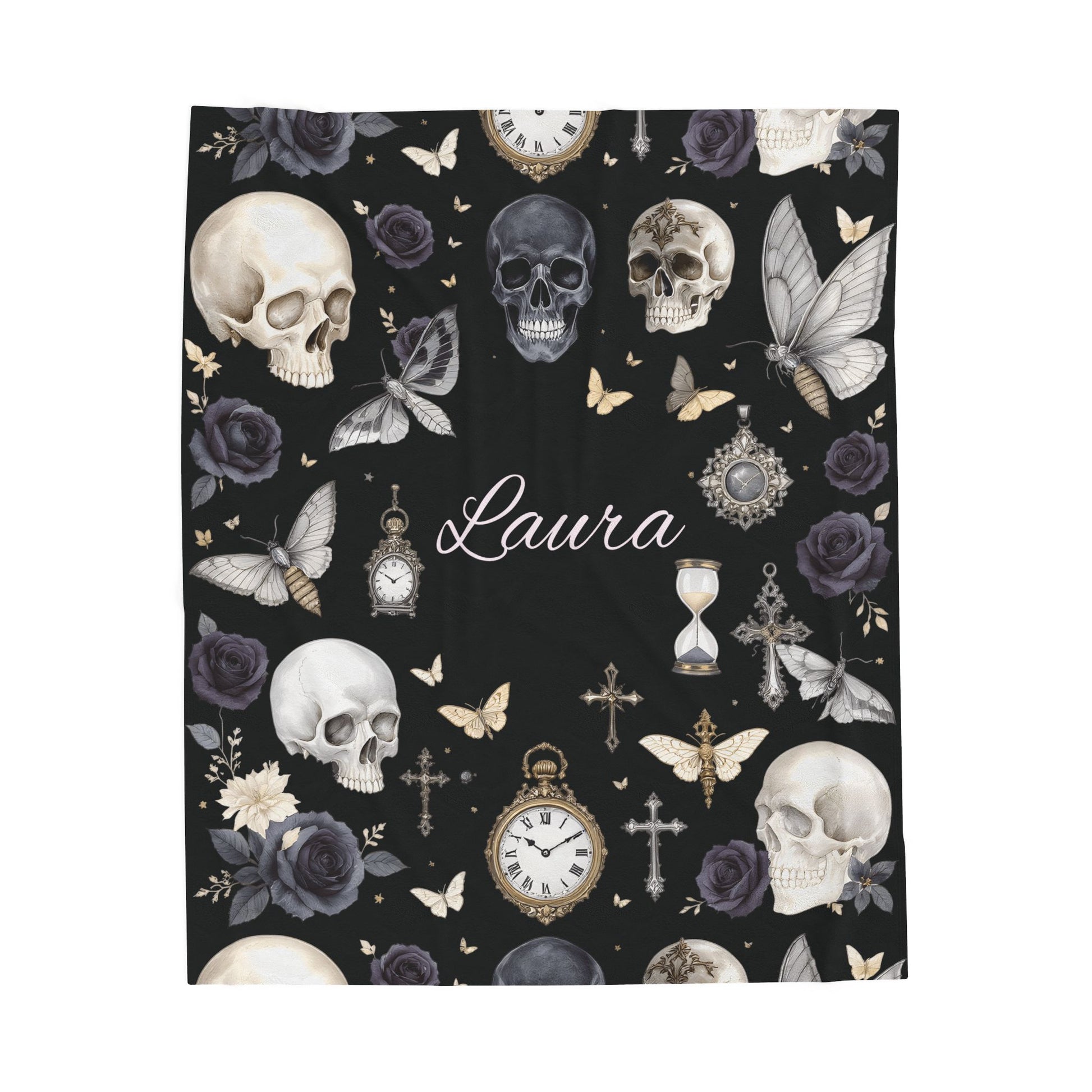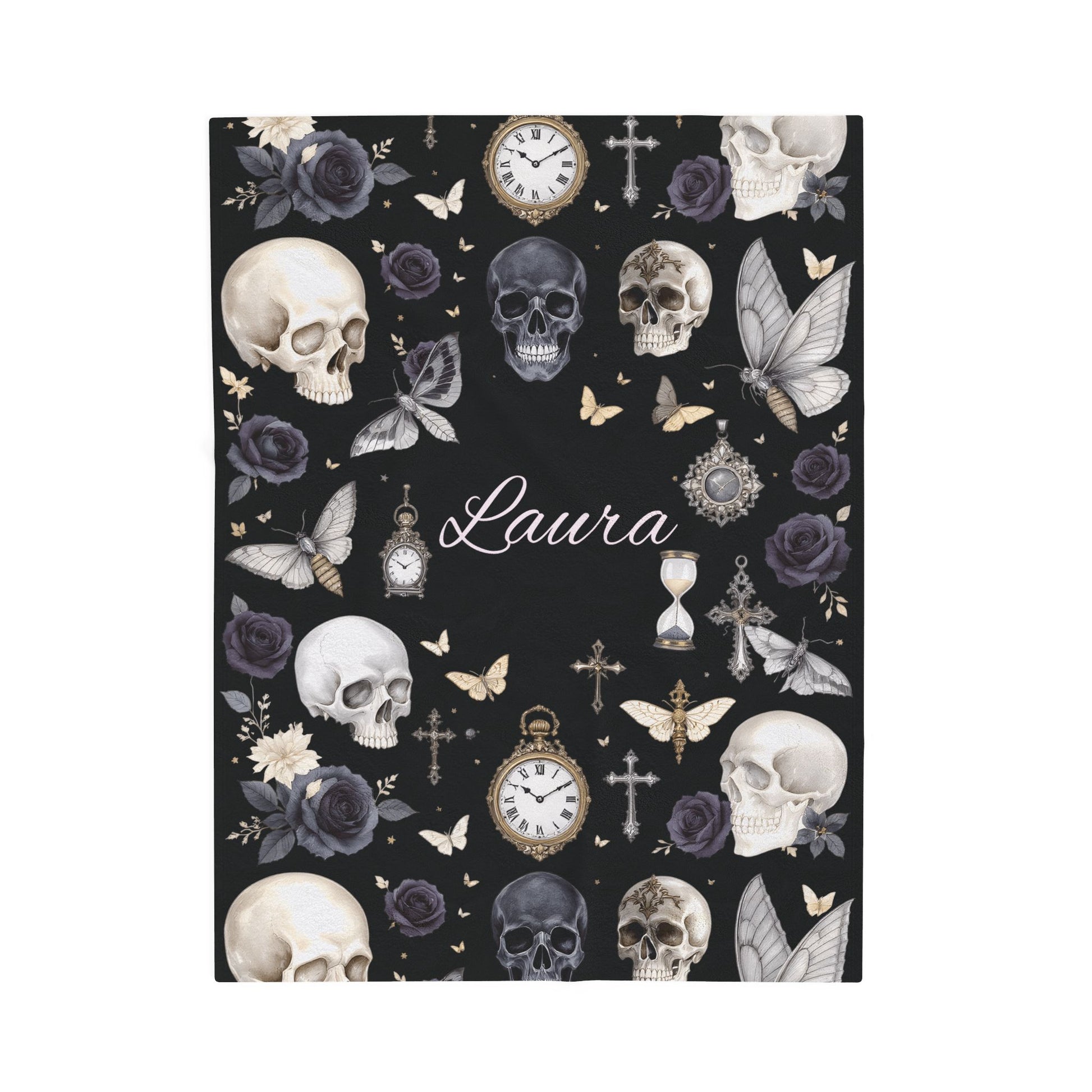 Gothic Skulls and Roses Velveteen Plush Blanket | Personalized Name Option