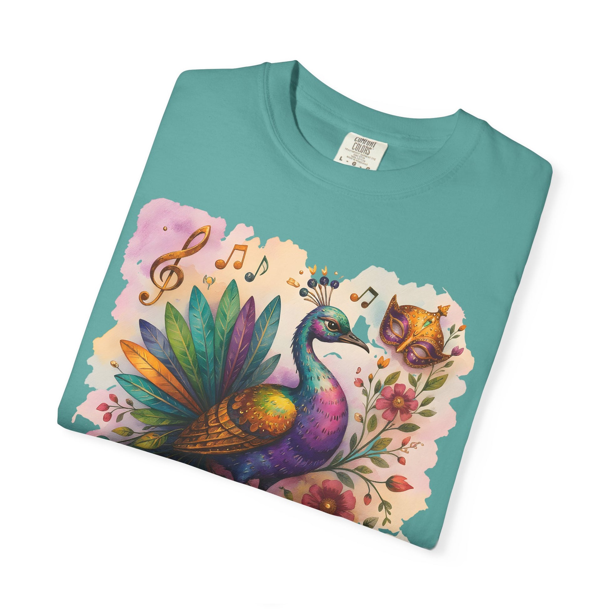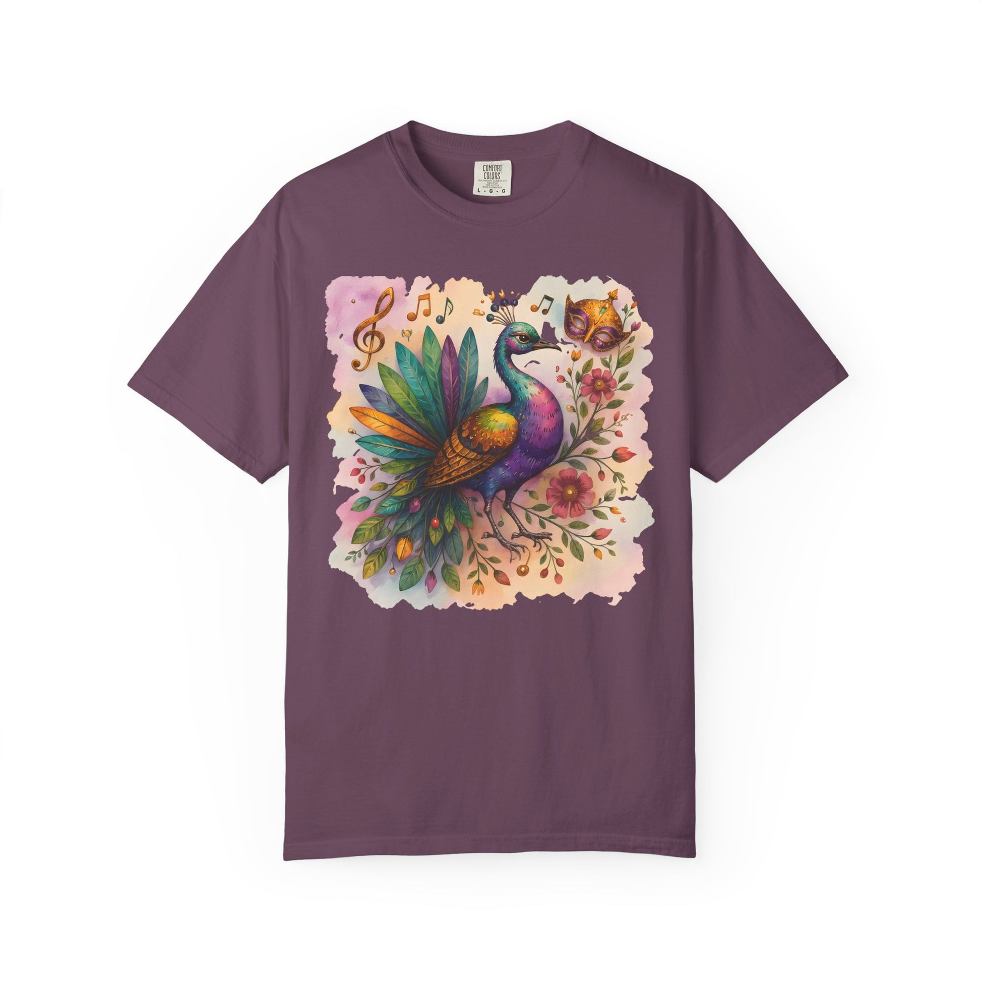 Celebrate vibrant festival style with this stunning peacock shirt, perfect for Mardi Gras, carnival outfits, and festival apparel. Designed to make a statement, this women's Mardi Gras tee features a bold, colorful peacock with intricate feather details that bloom across a heavyweight, garment-dyed fabric. The relaxed fit offers all-day comfort, making it ideal for outdoor markets, slow weekend mornings, or layered under a denim jacket for evening strolls.