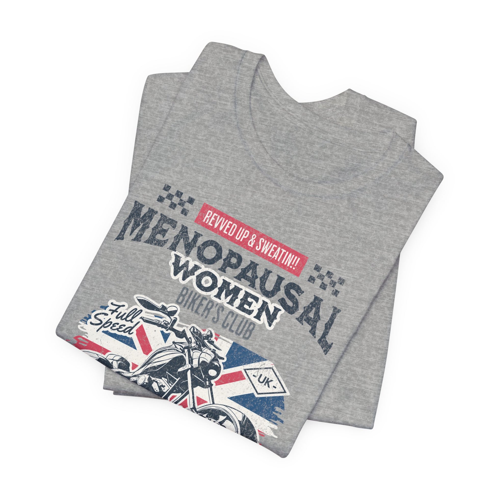 Menopausal Women's Biker Club T-Shirt, Menopause Humor Shirt, Female Biker Tee, Motorcycle Mom Gift, Moto Mama Shirt, Union Jack, Biker Babe