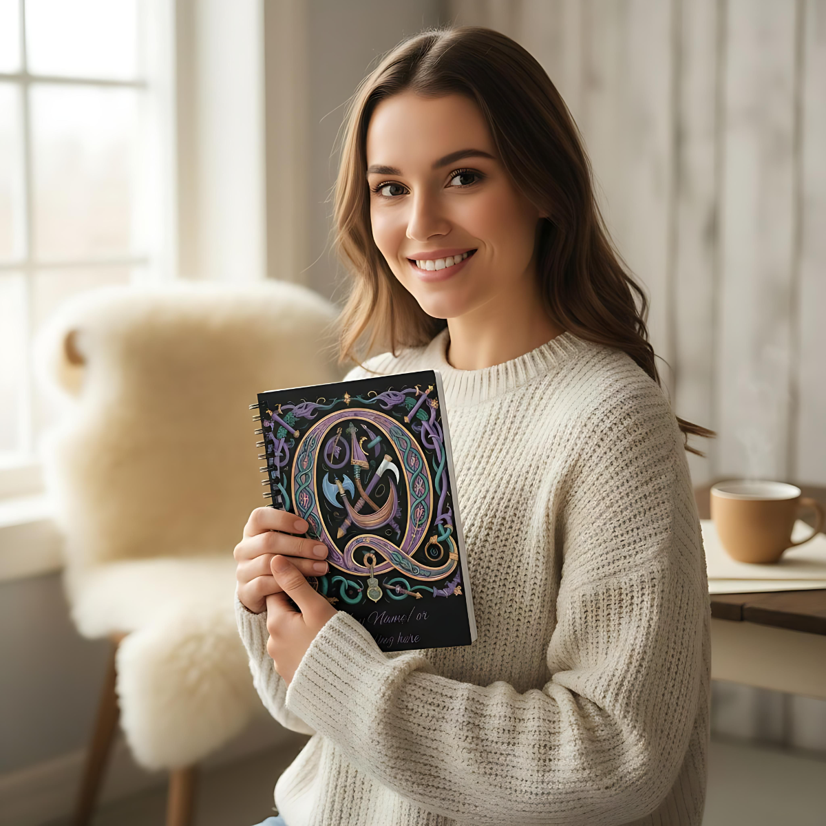 Embark on a mystical journey with our Personalized Norse Witchy Monogram A5 Notebook. This enchanting monogrammed notebook, inspired by Norse pagan traditions, is meticulously crafted to serve as your very own viking notebook or celtic journal. The custom journal cover complements the intricate lettering book design, creating an exquisite spiral bound book that's perfect for jotting down spells in your book of shadows or secrets in a witchcraft grimoire. With your name beautifully etched into this personalized diary, it becomes a grimoire journal that reflects your unique story.