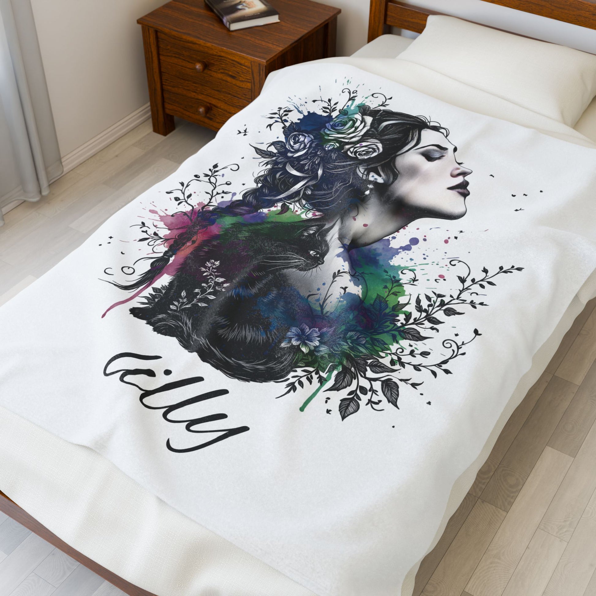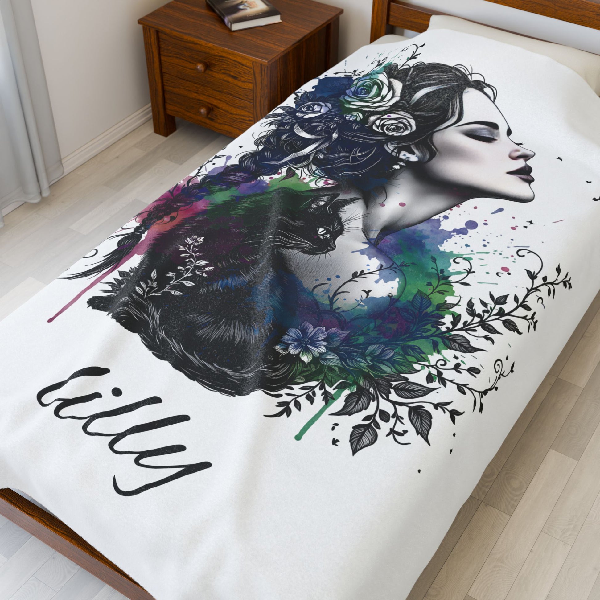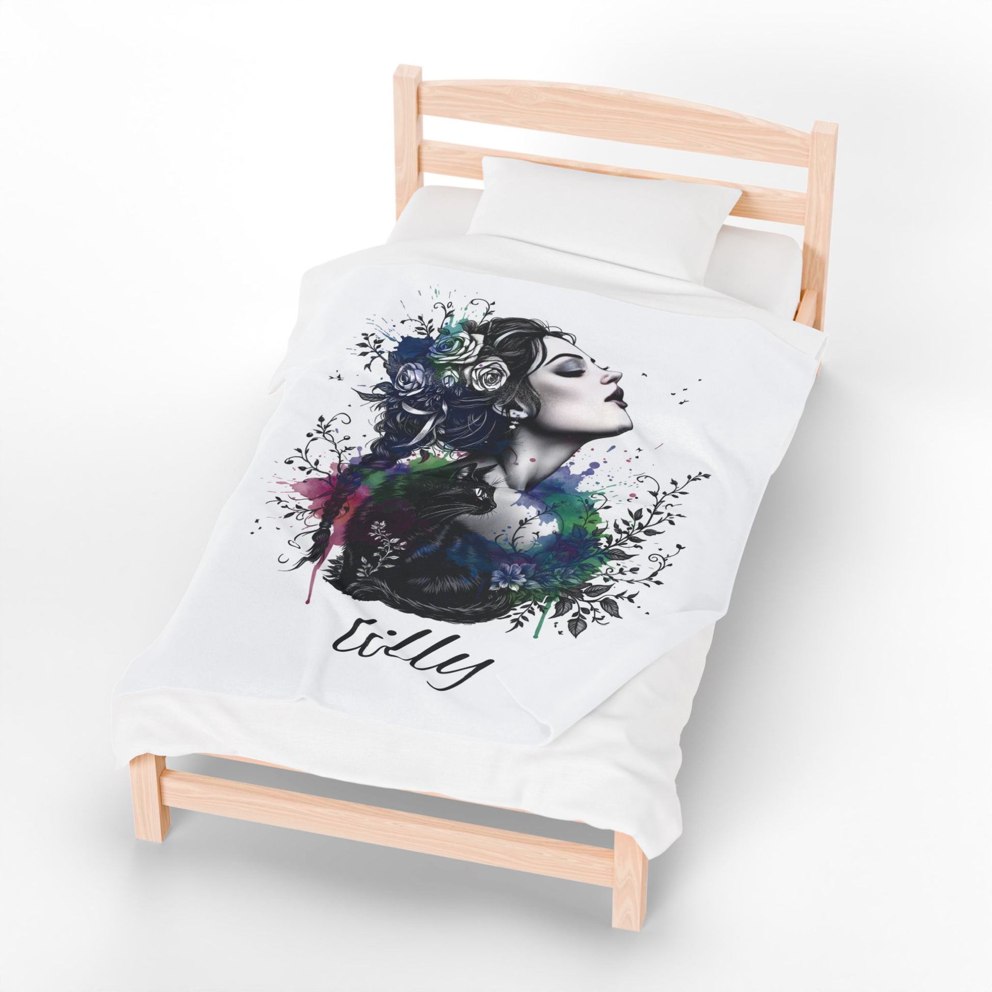 A lush velveteen plush blanket printed with a watercolor-style portrait of a serene woman surrounded by blooming roses, delicate vines, and a shadowy black cat. The artwork’s painterly splashes of blues, purples, and greens sit crisp and vibrant on one side of the blanket, while the reverse remains soft and clean white. The fabric feels sumptuously soft against skin and holds color well thanks to high-detail sublimation. Lightweight but cozy, it layers easily on a couch or at the foot of a bed and brings an intimate, artistic vibe to quiet evenings or creative nooks.