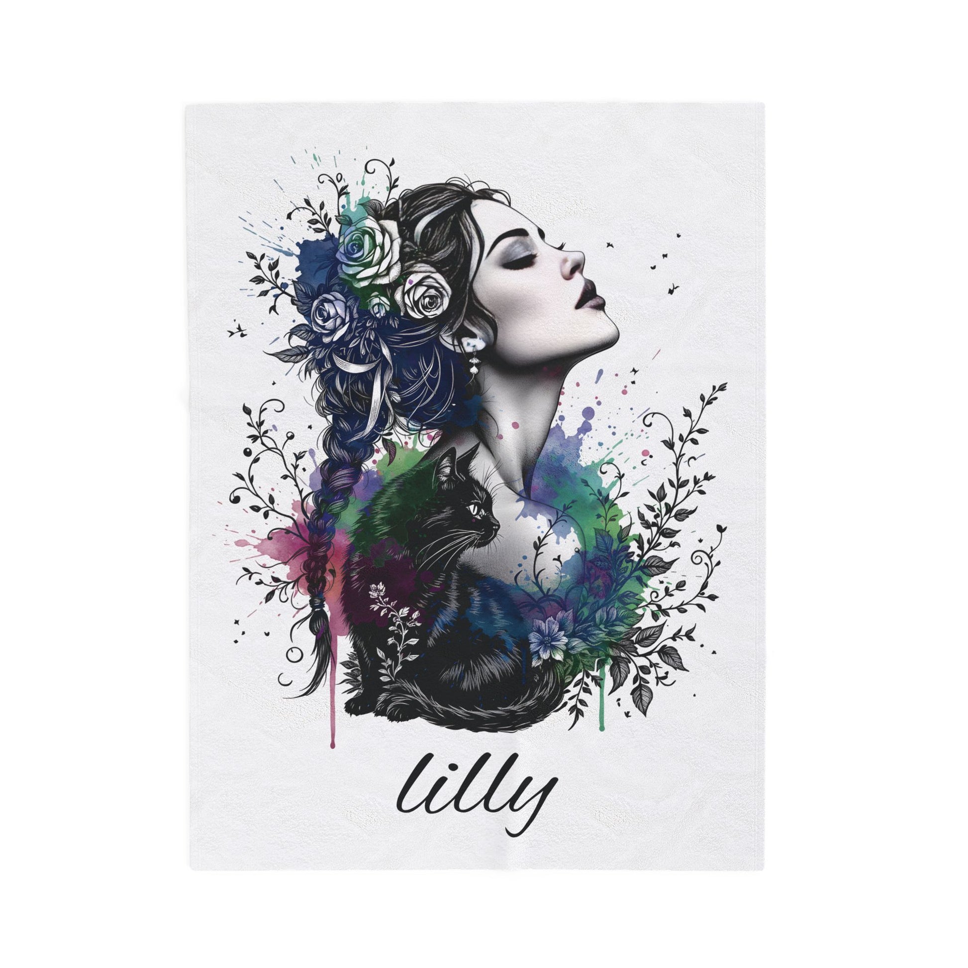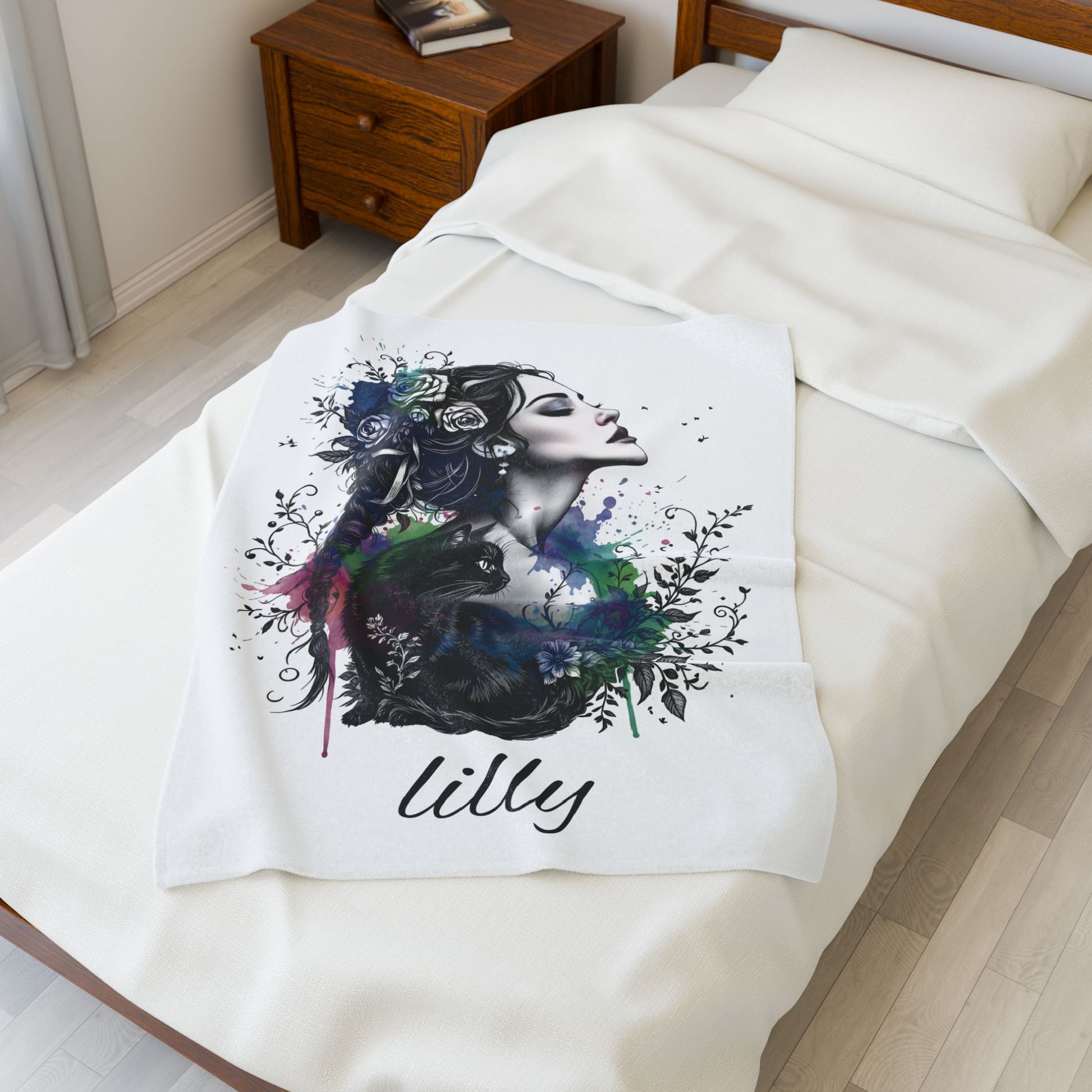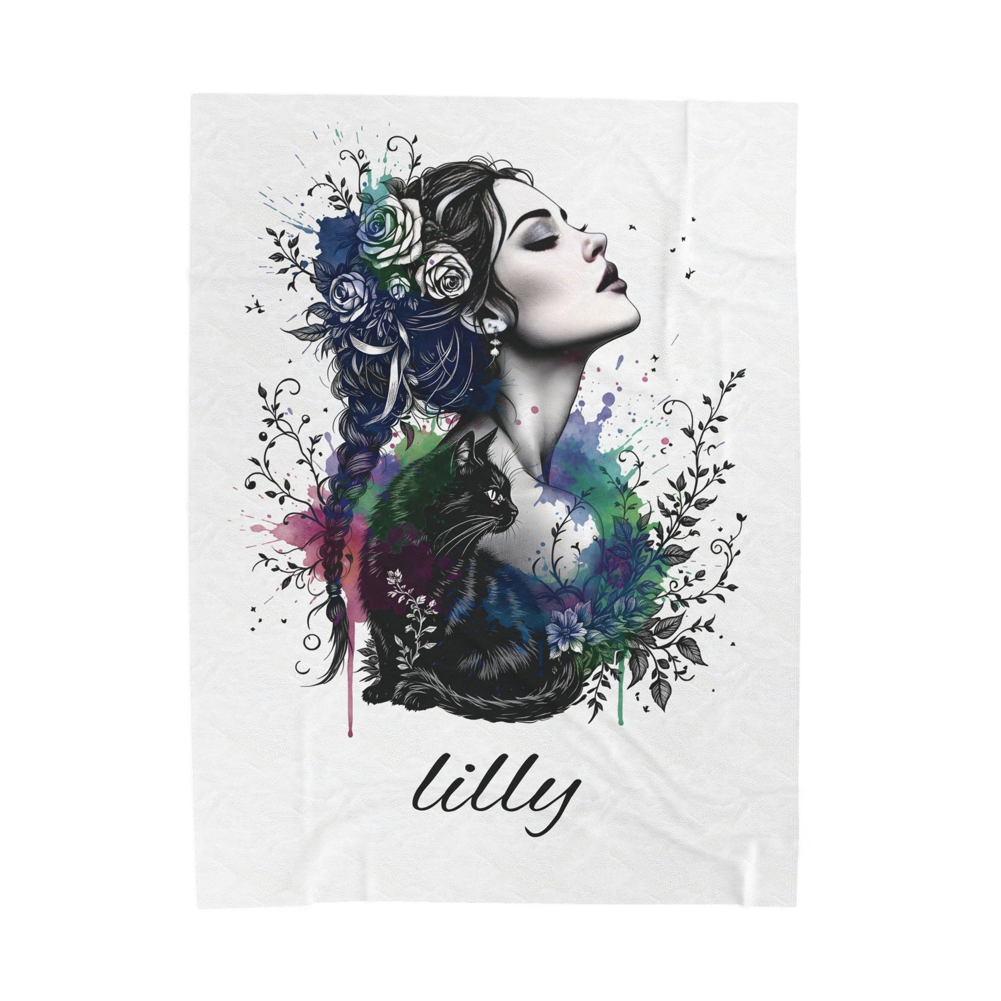A lush velveteen plush blanket printed with a watercolor-style portrait of a serene woman surrounded by blooming roses, delicate vines, and a shadowy black cat. The artwork’s painterly splashes of blues, purples, and greens sit crisp and vibrant on one side of the blanket, while the reverse remains soft and clean white. The fabric feels sumptuously soft against skin and holds color well thanks to high-detail sublimation. Lightweight but cozy, it layers easily on a couch or at the foot of a bed and brings an intimate, artistic vibe to quiet evenings or creative nooks.