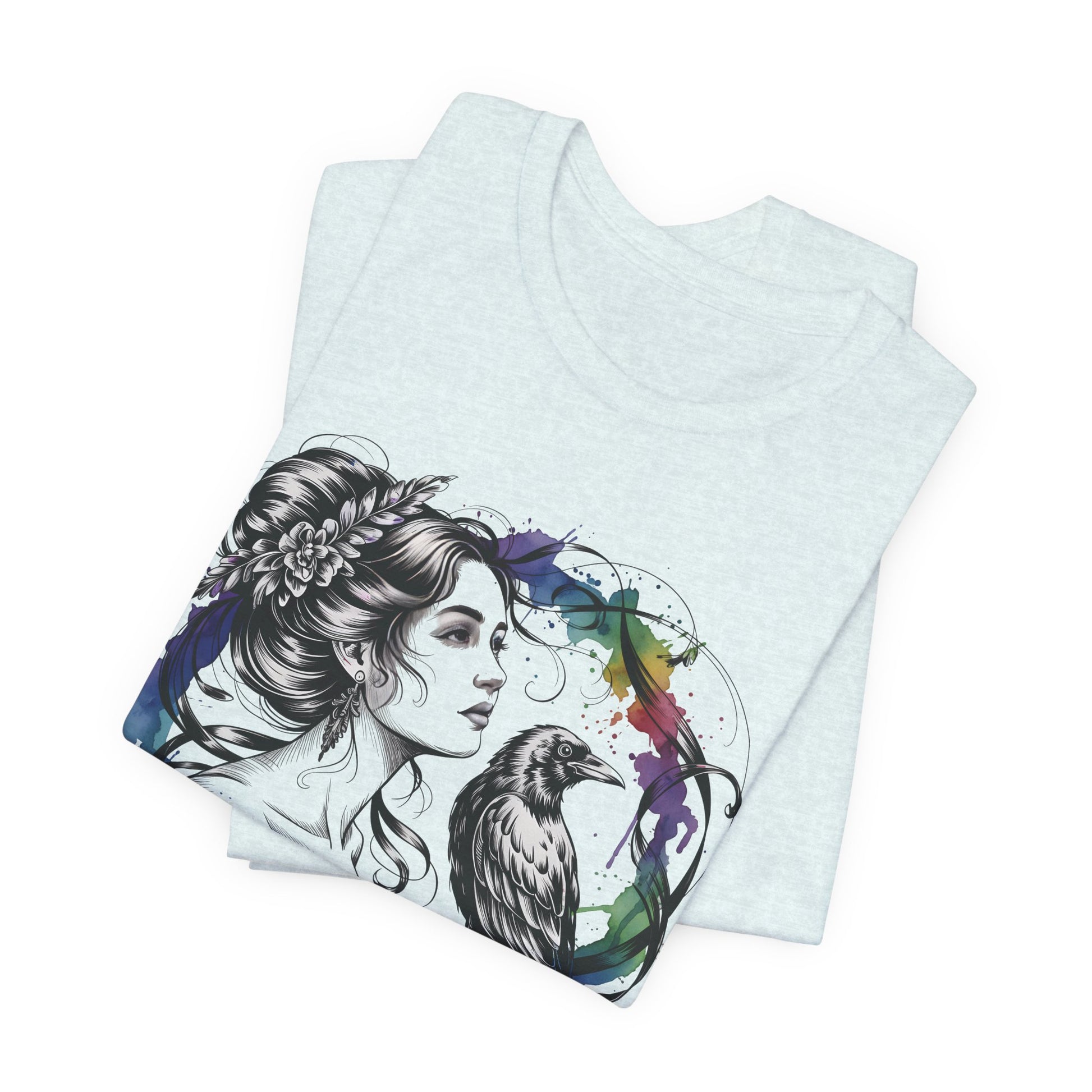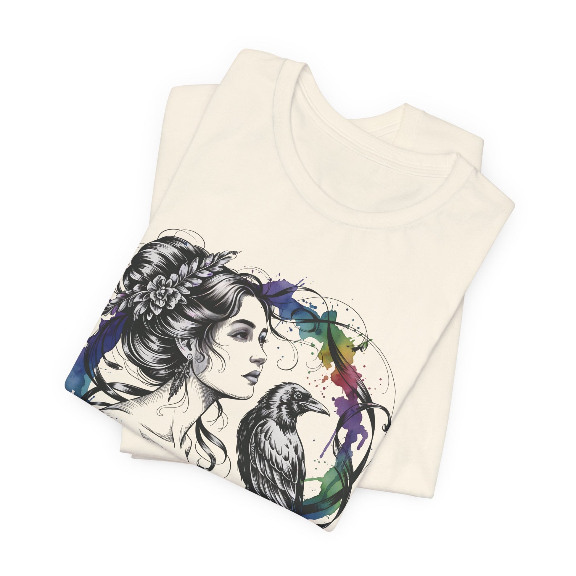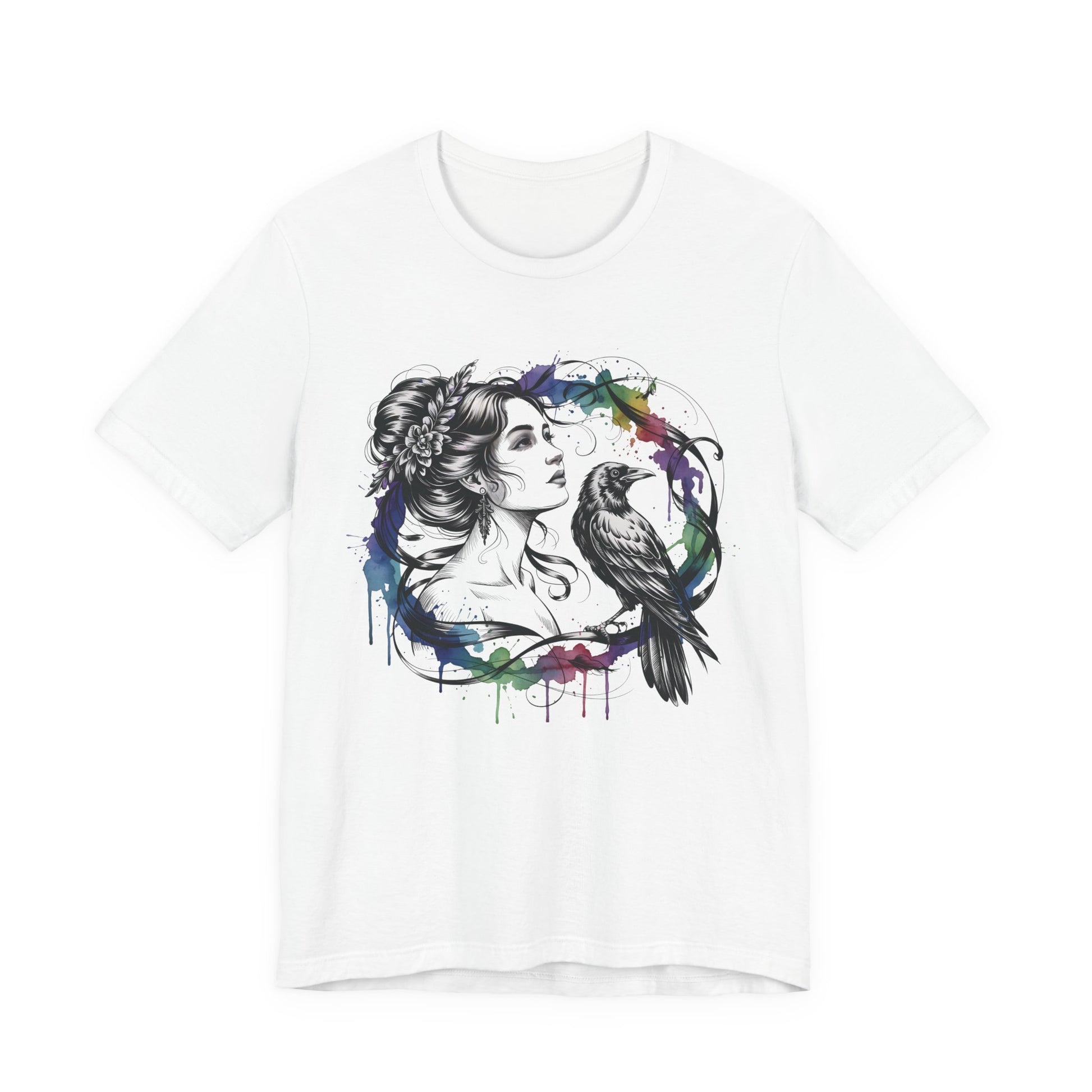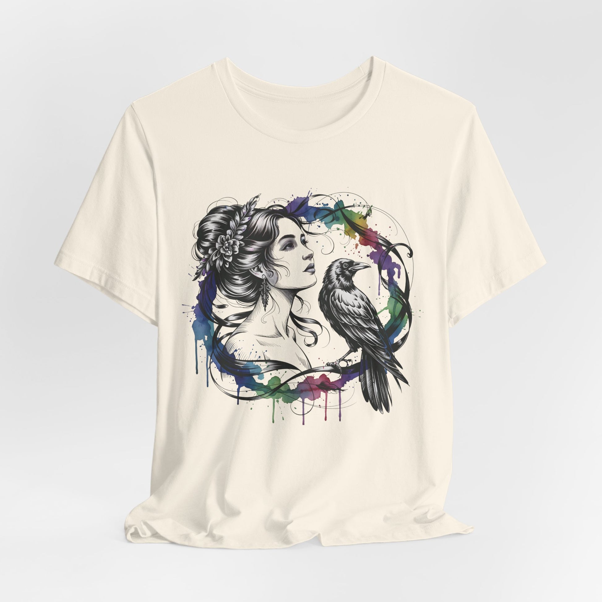 Soft, breathable cotton carries a moody, artful print that feels like a sketch brought to life. A delicate female portrait meets a raven inside a loose watercolor wreath — black linework with splashes of saturated color that drip like fresh paint. The tee drapes cleanly with a crew neckline and retail fit, so the image sits confidently on the chest without feeling stiff. Wear it with worn jeans, layered under a jacket, or alone when you want your outfit to speak in quiet, expressive tones. This shirt is for people who lean toward thoughtful, slightly gothic aesthetics and appreciate wearable art with handcrafted energy.
