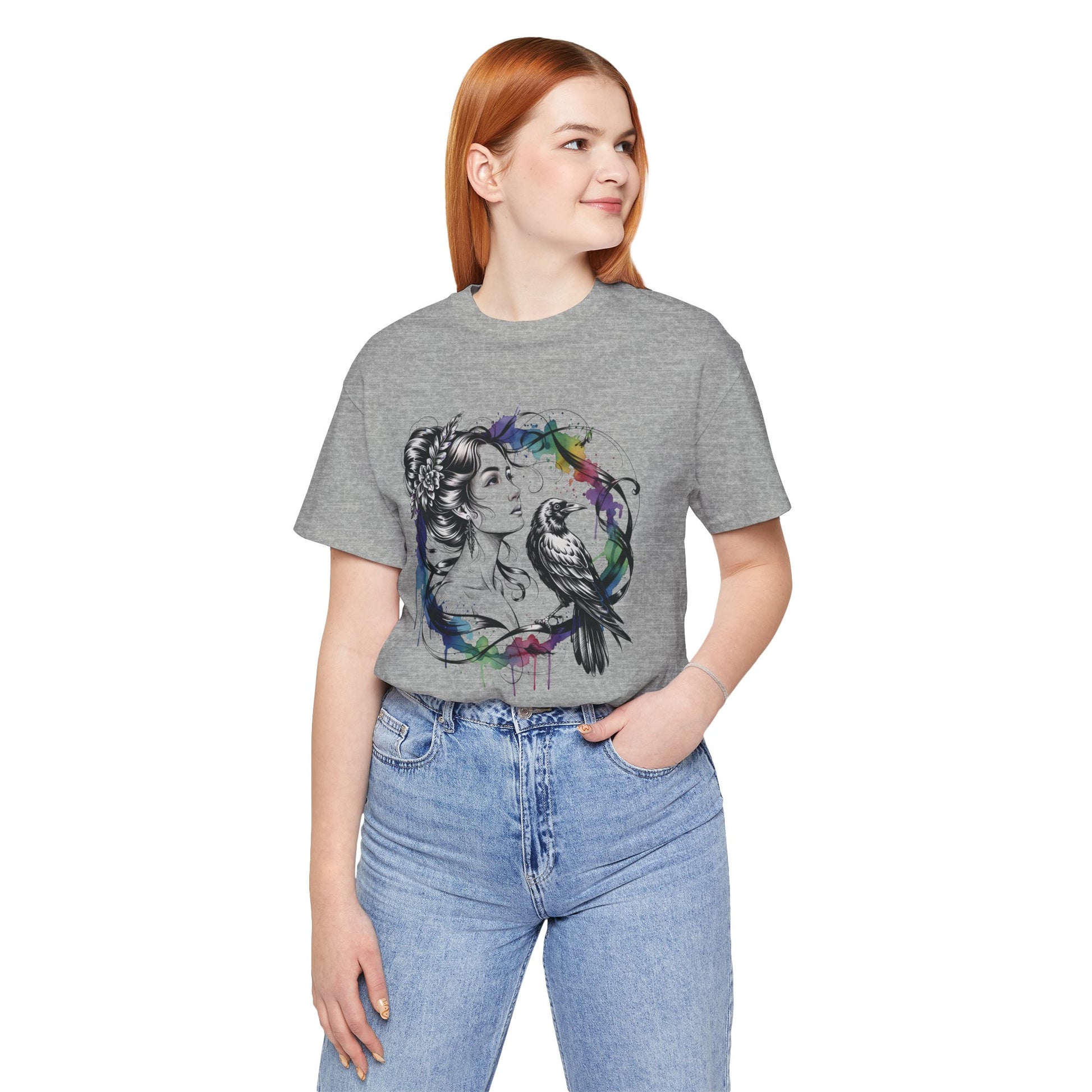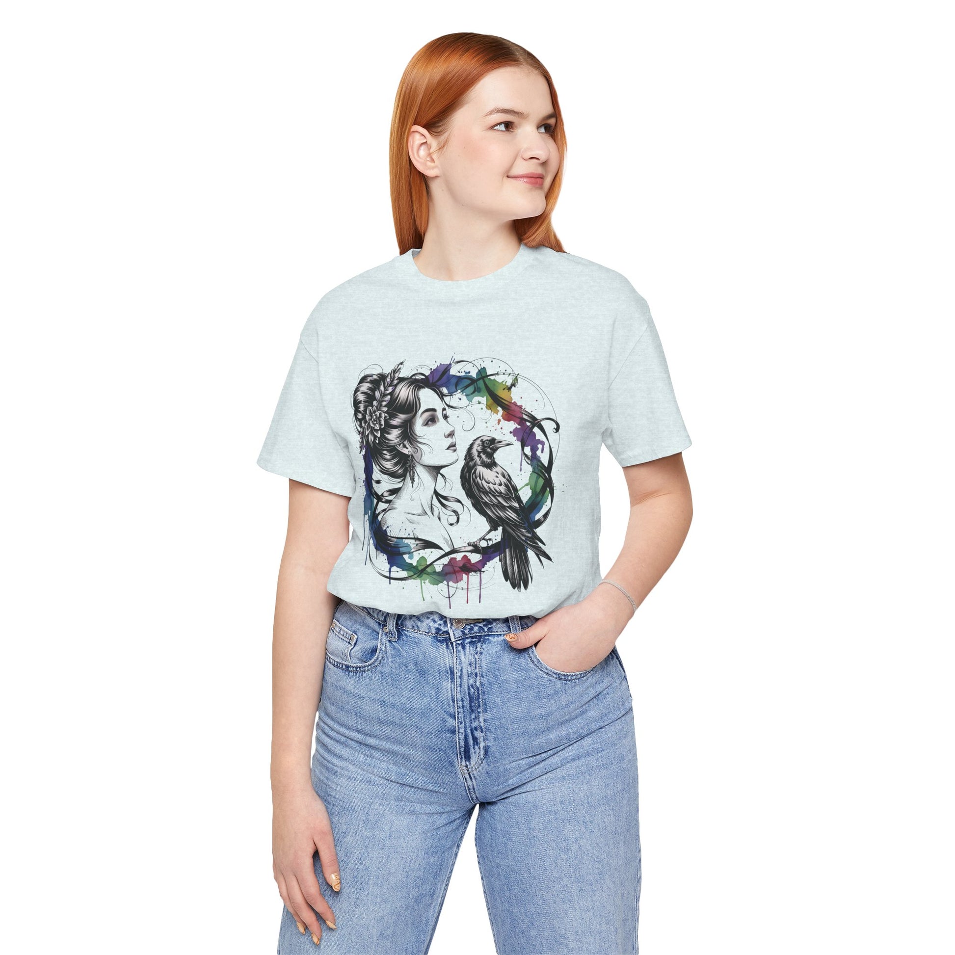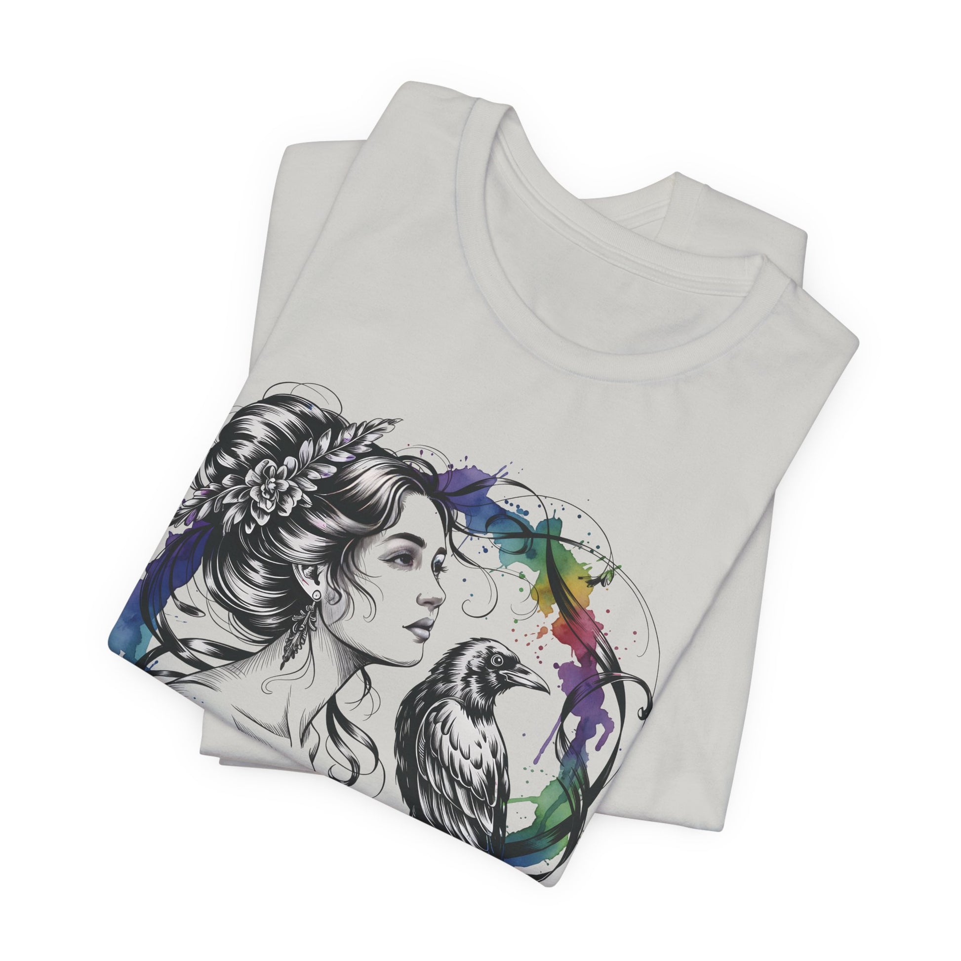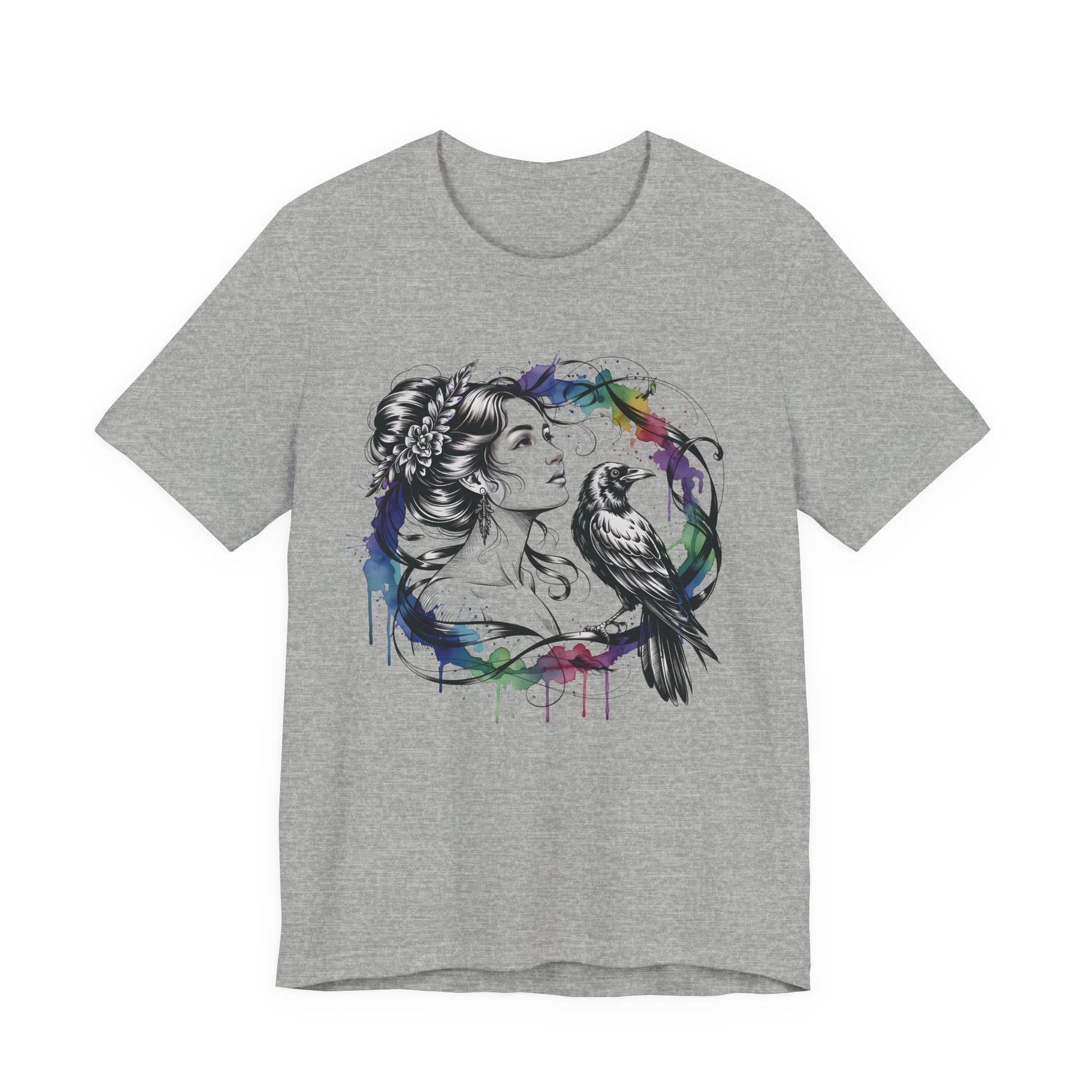 Soft, breathable cotton carries a moody, artful print that feels like a sketch brought to life. A delicate female portrait meets a raven inside a loose watercolor wreath — black linework with splashes of saturated color that drip like fresh paint. The tee drapes cleanly with a crew neckline and retail fit, so the image sits confidently on the chest without feeling stiff. Wear it with worn jeans, layered under a jacket, or alone when you want your outfit to speak in quiet, expressive tones. This shirt is for people who lean toward thoughtful, slightly gothic aesthetics and appreciate wearable art with handcrafted energy.