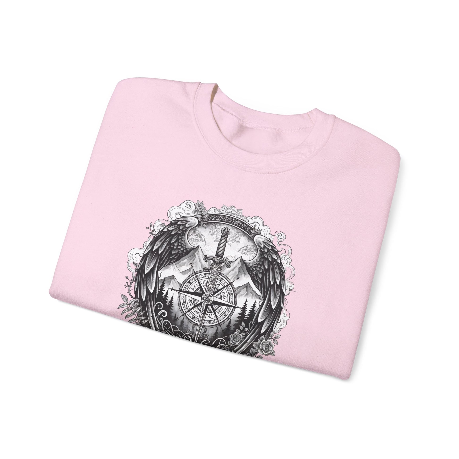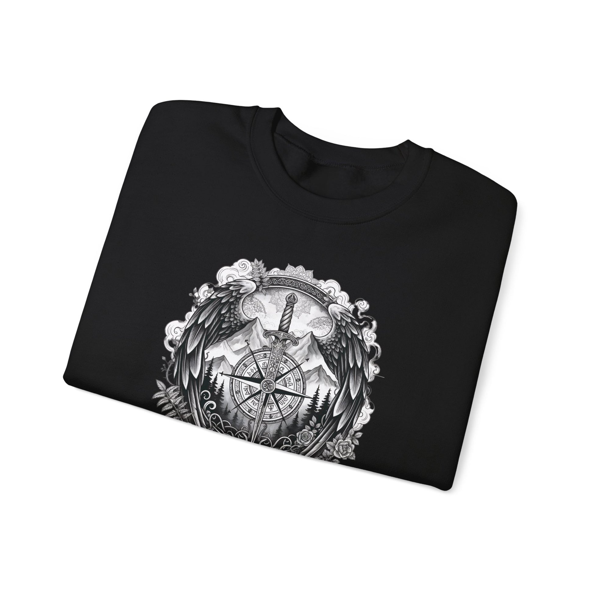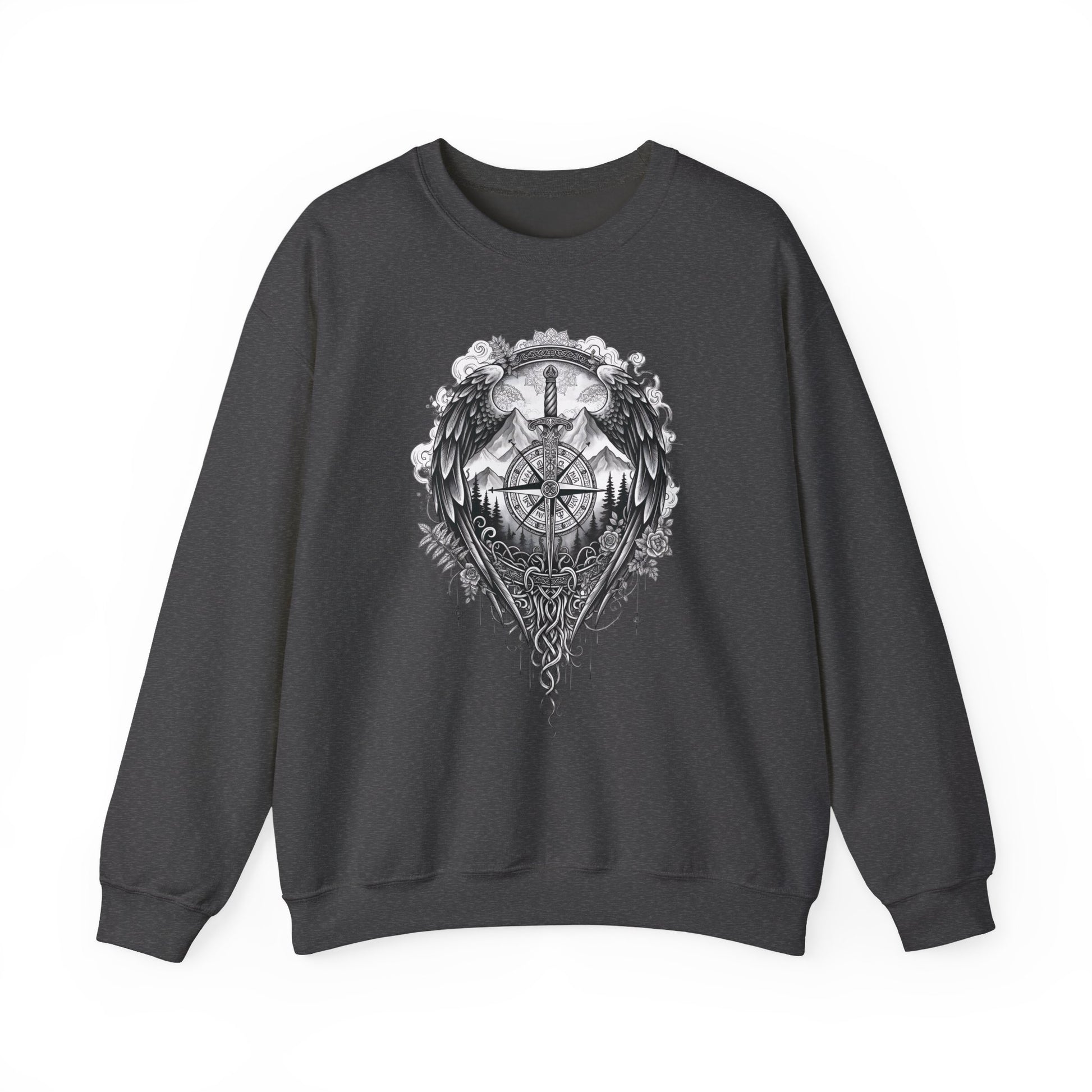 ⚔️ Viking Compass (Vegvisir) Nordic Sweatshirt – Norse Pagan Symbolism & Celtic Artwork Stay warm while carrying the power of the ancient Norse with this beautifully detailed Viking Compass sweatshirt, featuring the Vegvisir — the legendary pagan symbol meant to guide and protect its wearer. Surrounded by Celtic knotwork, wings, mountains, and mythological elements, this design blends Norse spirituality, pagan symbolism, and gothic aesthetics into a bold and meaningful piece of wearable art. Perfect for fans of Viking history, Norse runes, dark academia style, alternative clothing, festivals, and pagan-inspired fashion. ⚔️ PERFECT FOR Viking enthusiasts Pagan + Norse spirituality Rune & mythology fans Festival and concert outfits Gothic or alternative clothing lovers Casual everyday wear with symbolic meaning