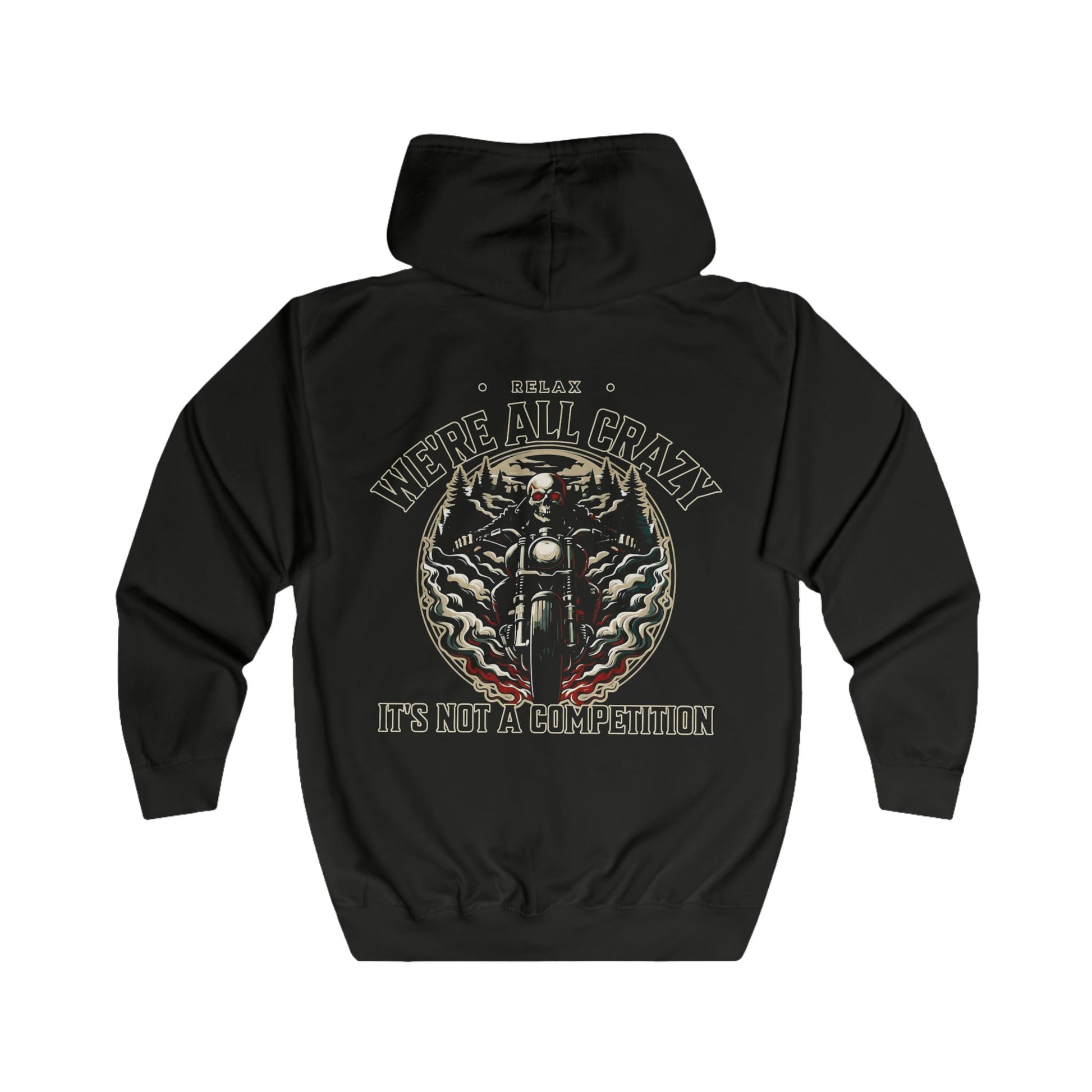 Introducing the "We're All Crazy Biker" Full Zip Hoodie—a symphony of style and rebellious spirit. This biker hoodie is more than motorcycle apparel; it's a statement, capturing the essence of bike life with its bold skull design and the playful motto, "Relax, we're all crazy." Crafted for true aficionados of the road, it merges the rugged charm of biker apparel with the comfort of a hoodie for bikers. The perfect bike lover gift, this rider hoodie is not just about the ride; it's about the ride and beyond—because it's not a competition, it's a lifestyle.